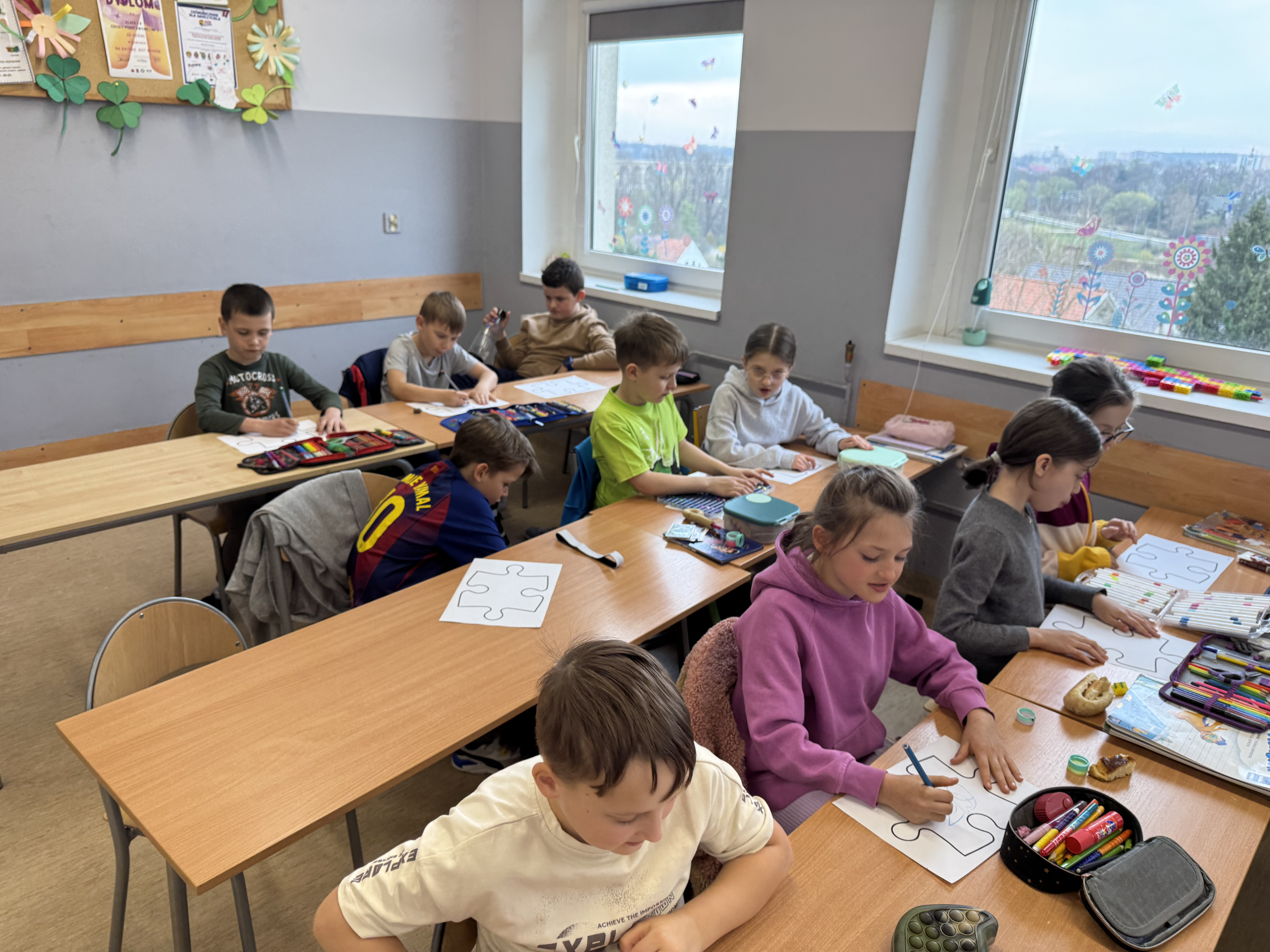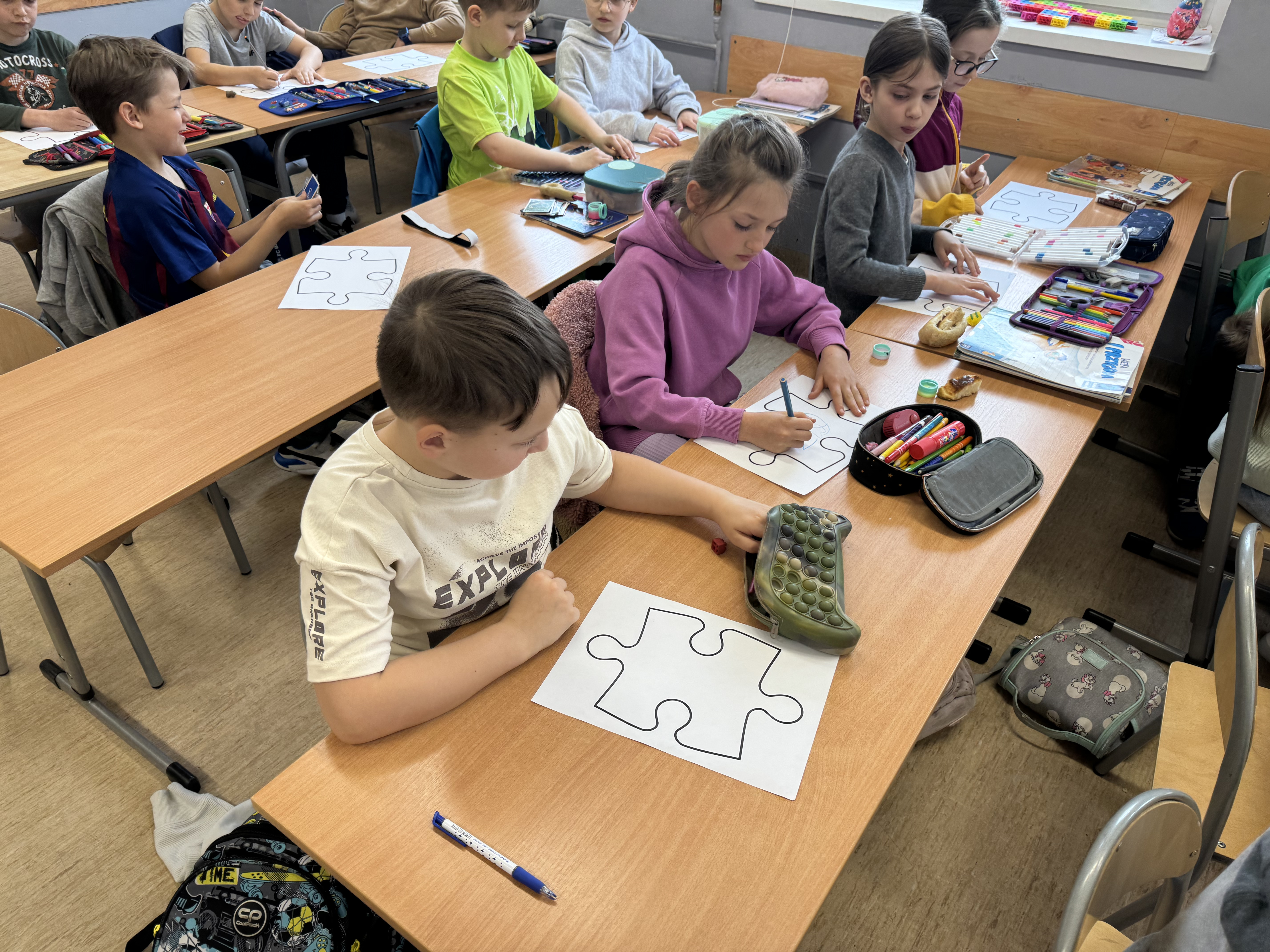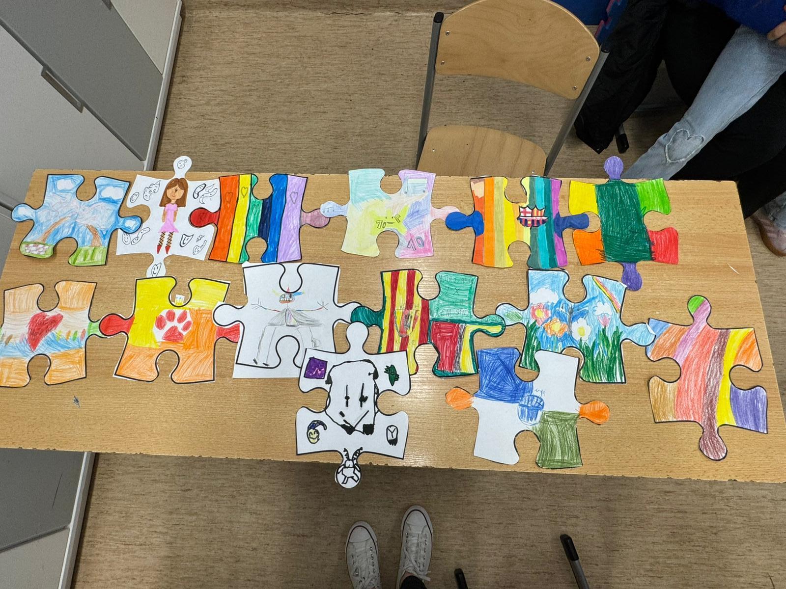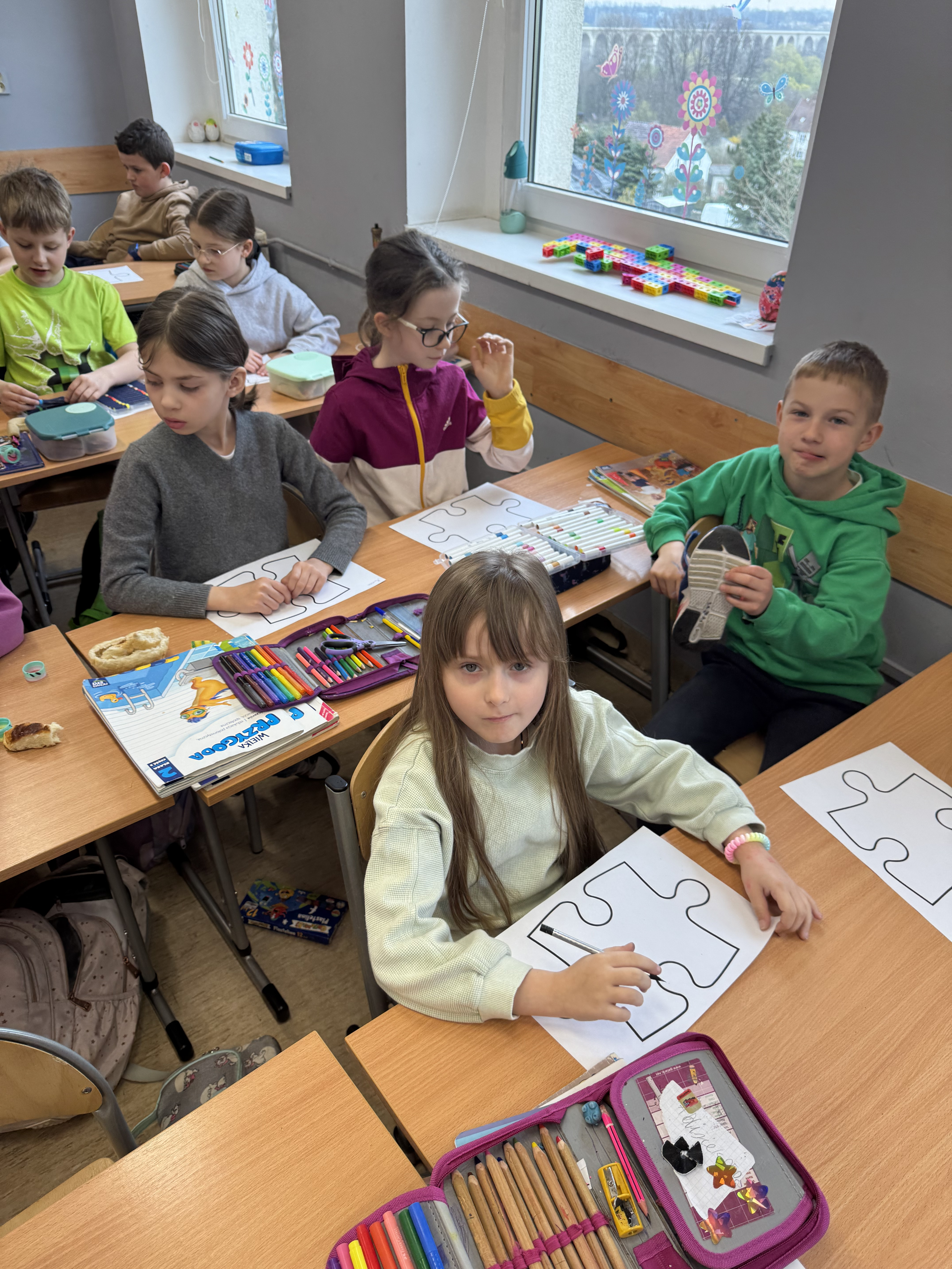Zajęcia rozpoczęły się rozmową wprowadzającą na temat autyzmu. Uczniowie dzielili się swoją wiedzą i spostrzeżeniami, a nauczyciel wyjaśnił, czym jest autyzm, jakie są jego objawy oraz w jaki sposób można wspierać osoby ze spektrum. Następnie uczniowie obejrzeli film edukacyjny o autyzmie, który w przystępny sposób przedstawiał codzienne doświadczenia osób autystycznych. Po projekcji odbyła się rozmowa o filmie – uczniowie omawiali swoje wrażenia, emocje oraz to, czego nowego się dowiedzieli. W części plastycznej uczniowie wykonali prace artystyczne – malowali puzzle, które są symbolem autyzmu. Każdy uczeń ozdobił swój element w indywidualny sposób, a następnie wszystkie puzzle zostały połączone w jedną wspólną kompozycję, symbolizującą jedność i różnorodność.