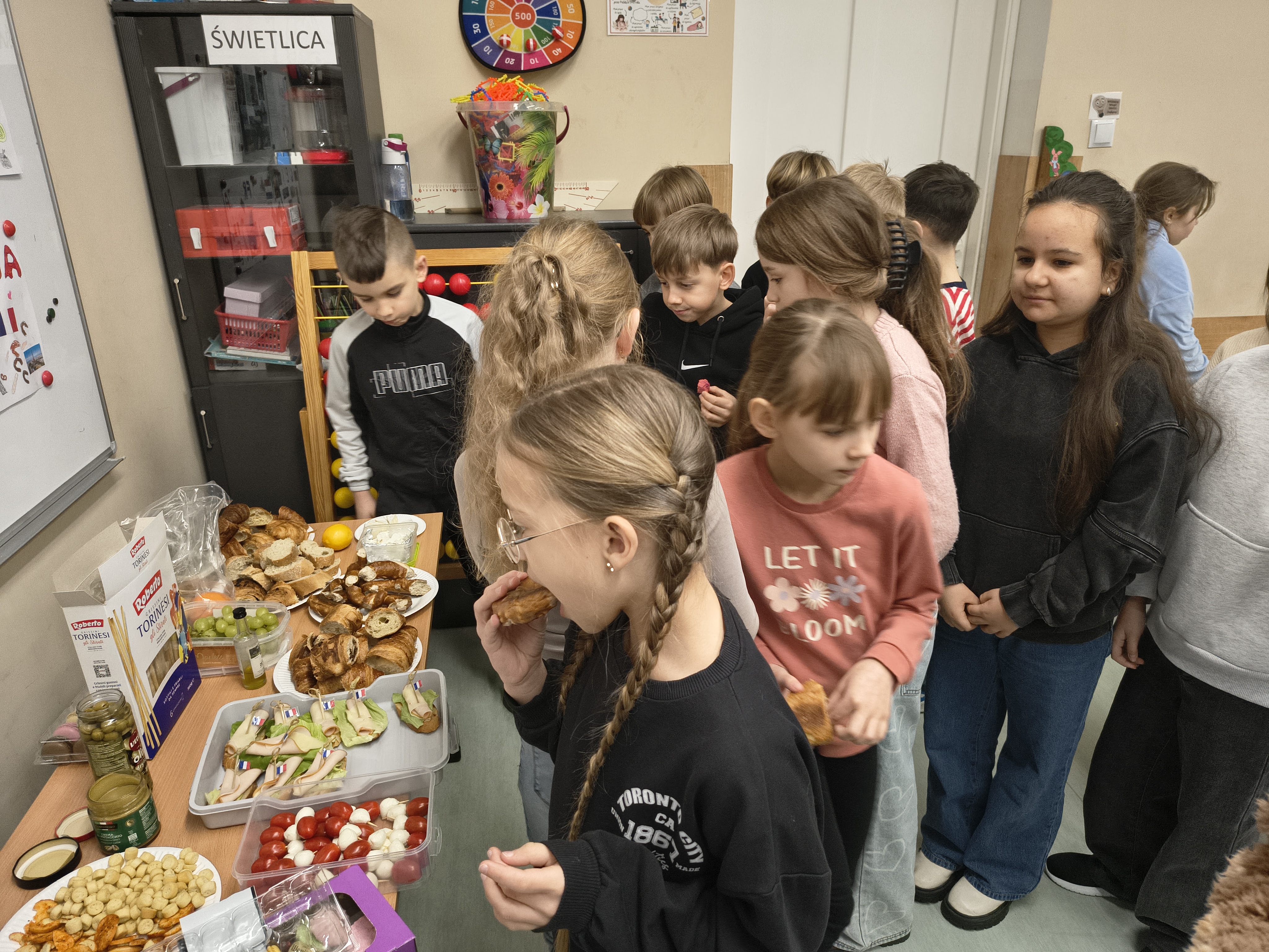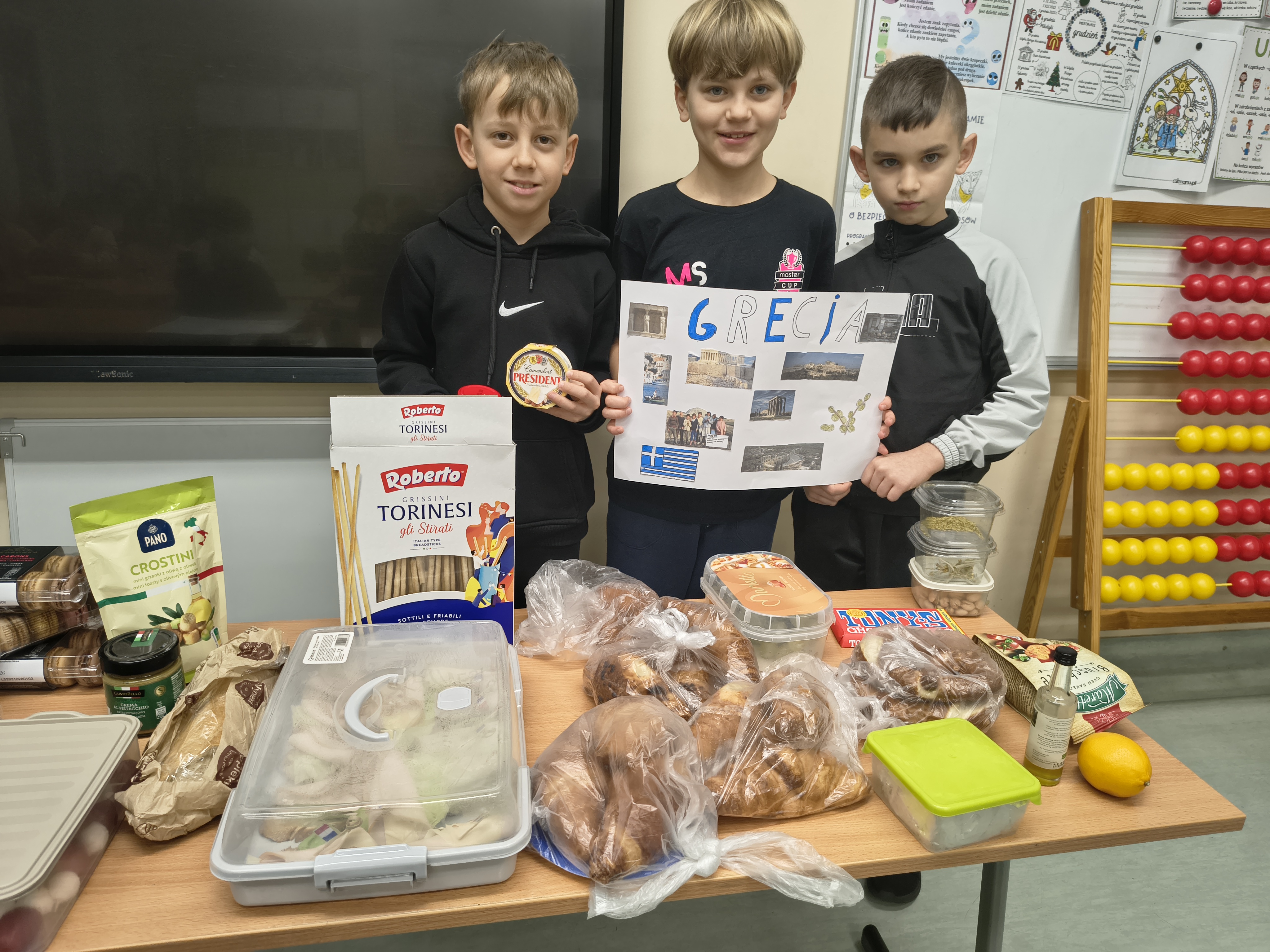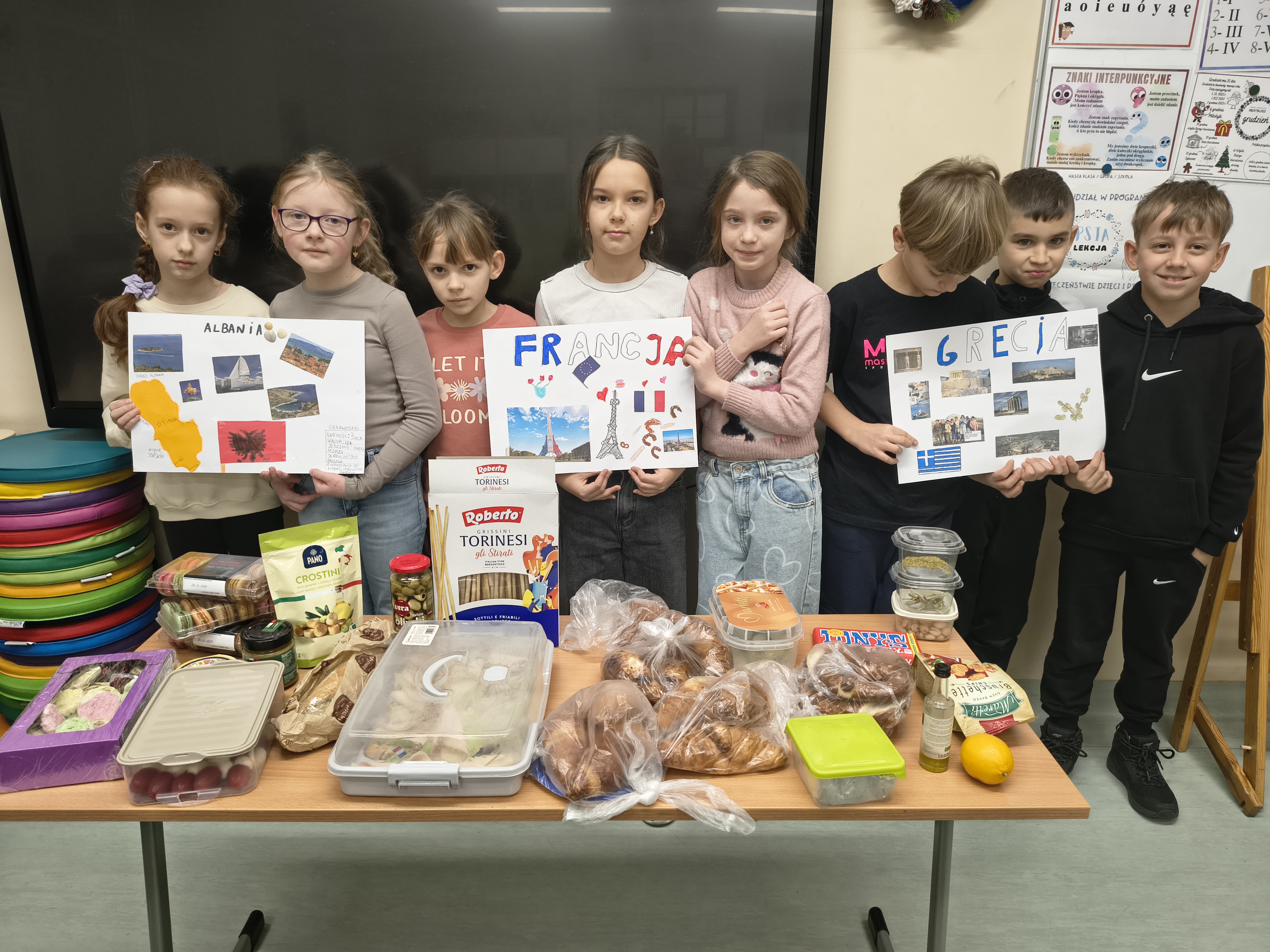 W dniach 12-15 stycznia 2026 r. uczniowie klas trzecich, wraz z wychowawczyniami - panią Eweliną Król i panią Ewą Nadwodną, uczestniczyli w zajęciach pod hasłem „Polska w Europie”. Interaktywne lekcje miały na celu poznanie hymnu, flagi oraz państw członkowskich Unii Europejskiej. Dzieci z kl. 3a wykonały w grupach plakaty z informacjami o wybranym przez siebie kraju. Zwieńczeniem było przygotowanie przez uczniów „europejskiego stołu”, na którym królowały: sery, bagietki, rogaliki, precle, kanapki, oliwki oraz oliwa. Uczniowie oglądali także hiszpańskie tańce i słuchali włoskiej muzyki. Z kolei dzieci z kl. 3b poznawały kraje europejskie poprzez różnorodne zabawy. Uczniowie grali w gry planszowe, układali puzzle, kolorowali flagi państw oraz „palcem po mapie” wędrowali po różnych krajach Europy. Dużym zainteresowaniem cieszyło się również oglądanie pamiątek przywiezionych z wycieczek po Europie. Na zakończenie dzieci wspólnie zaśpiewały hymn Unii Europejskiej.