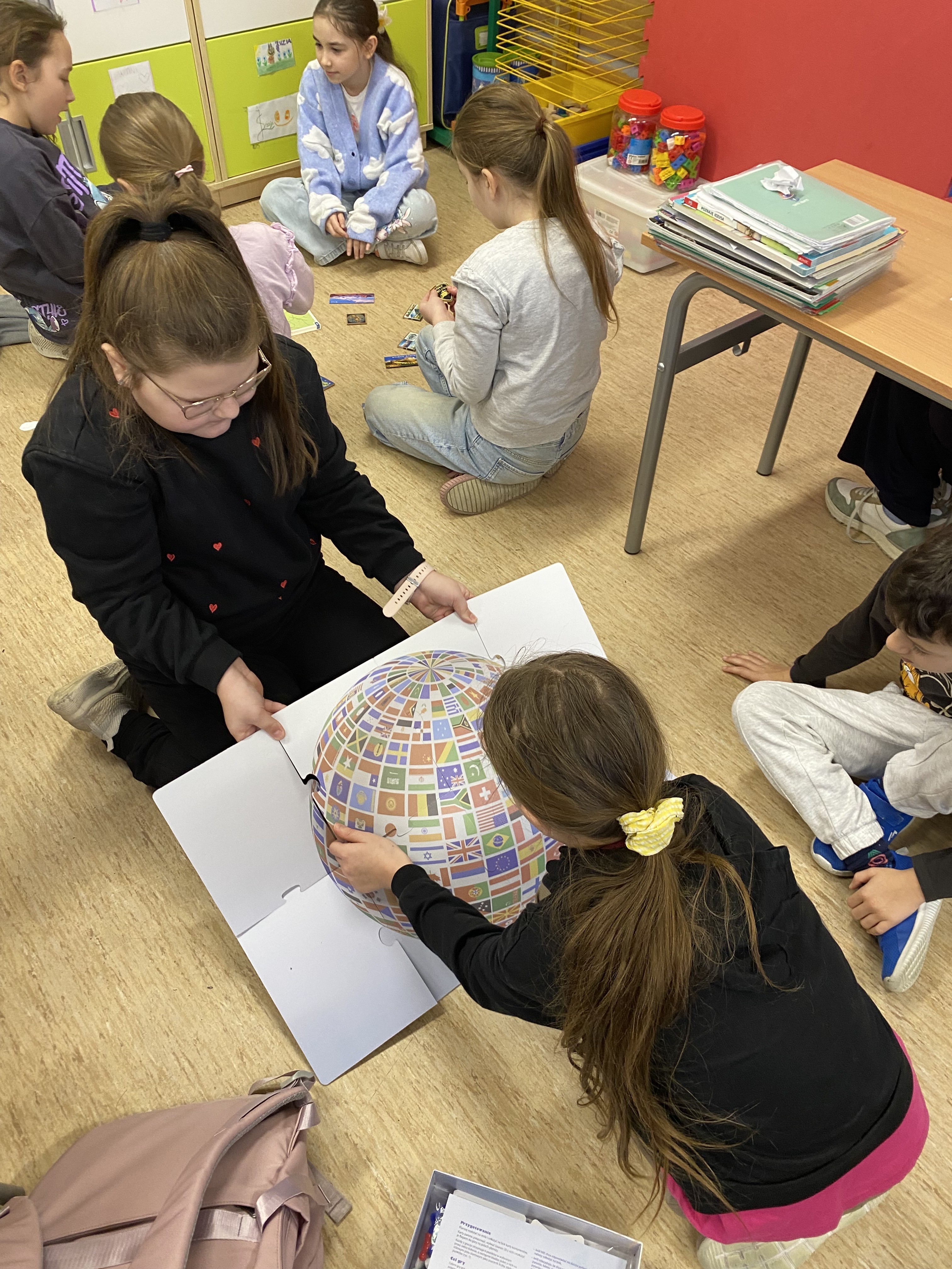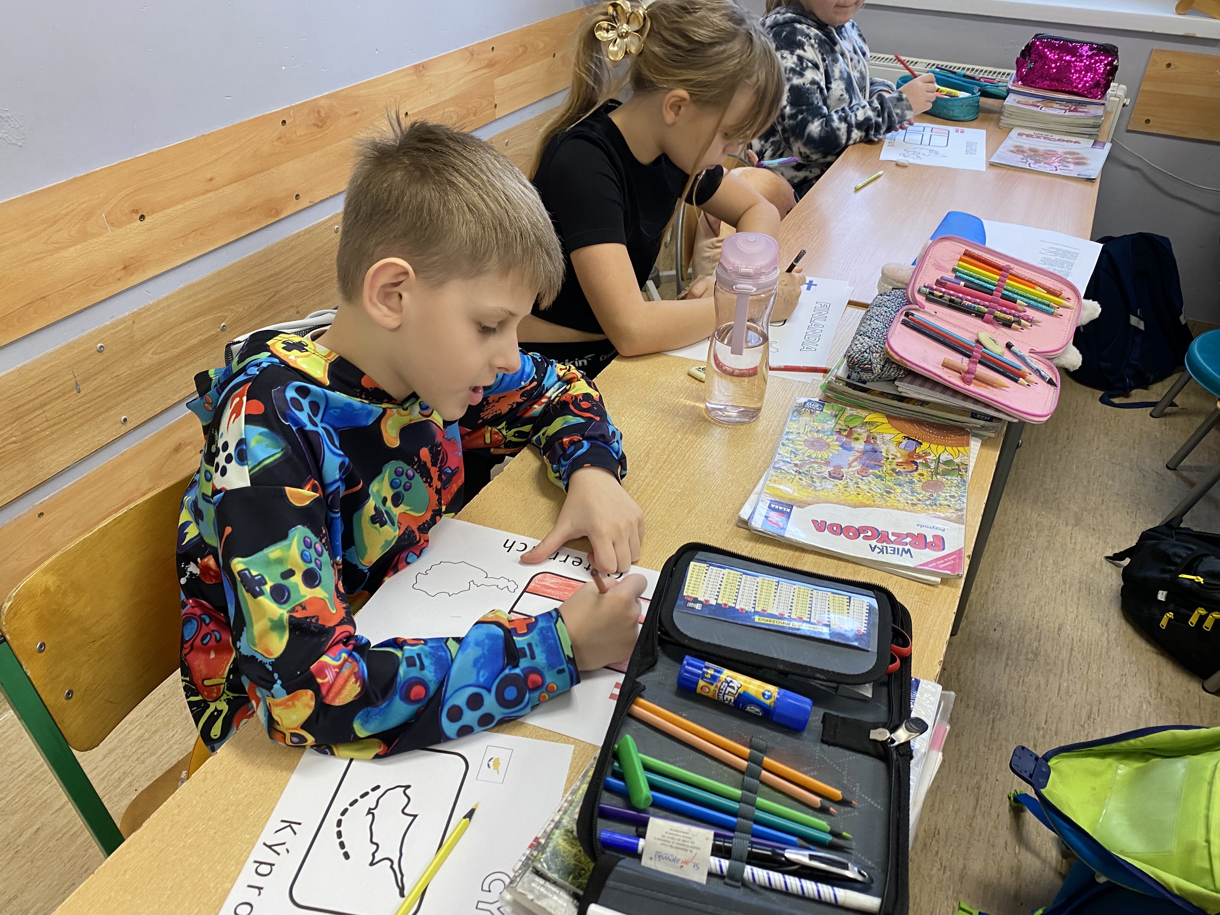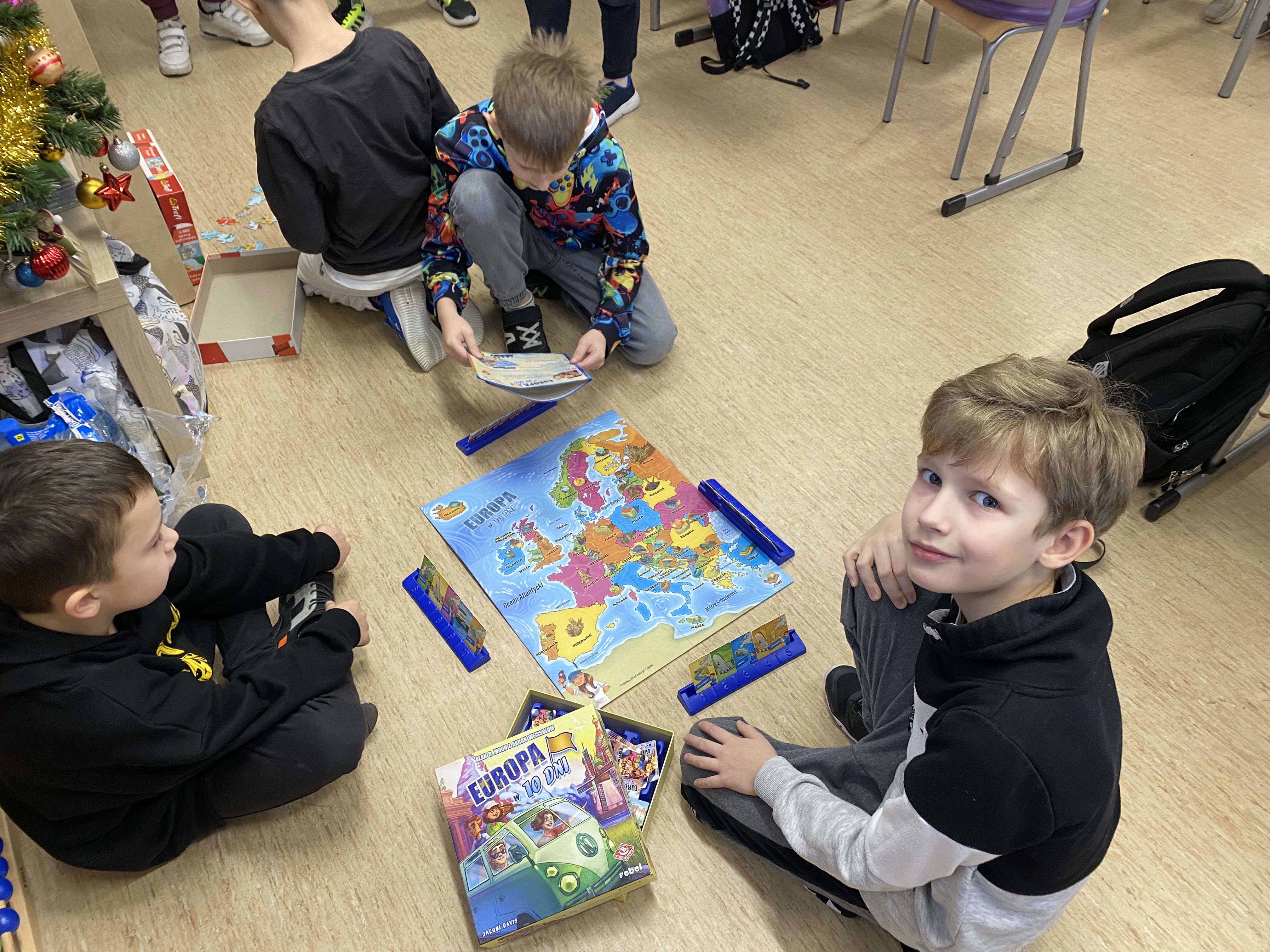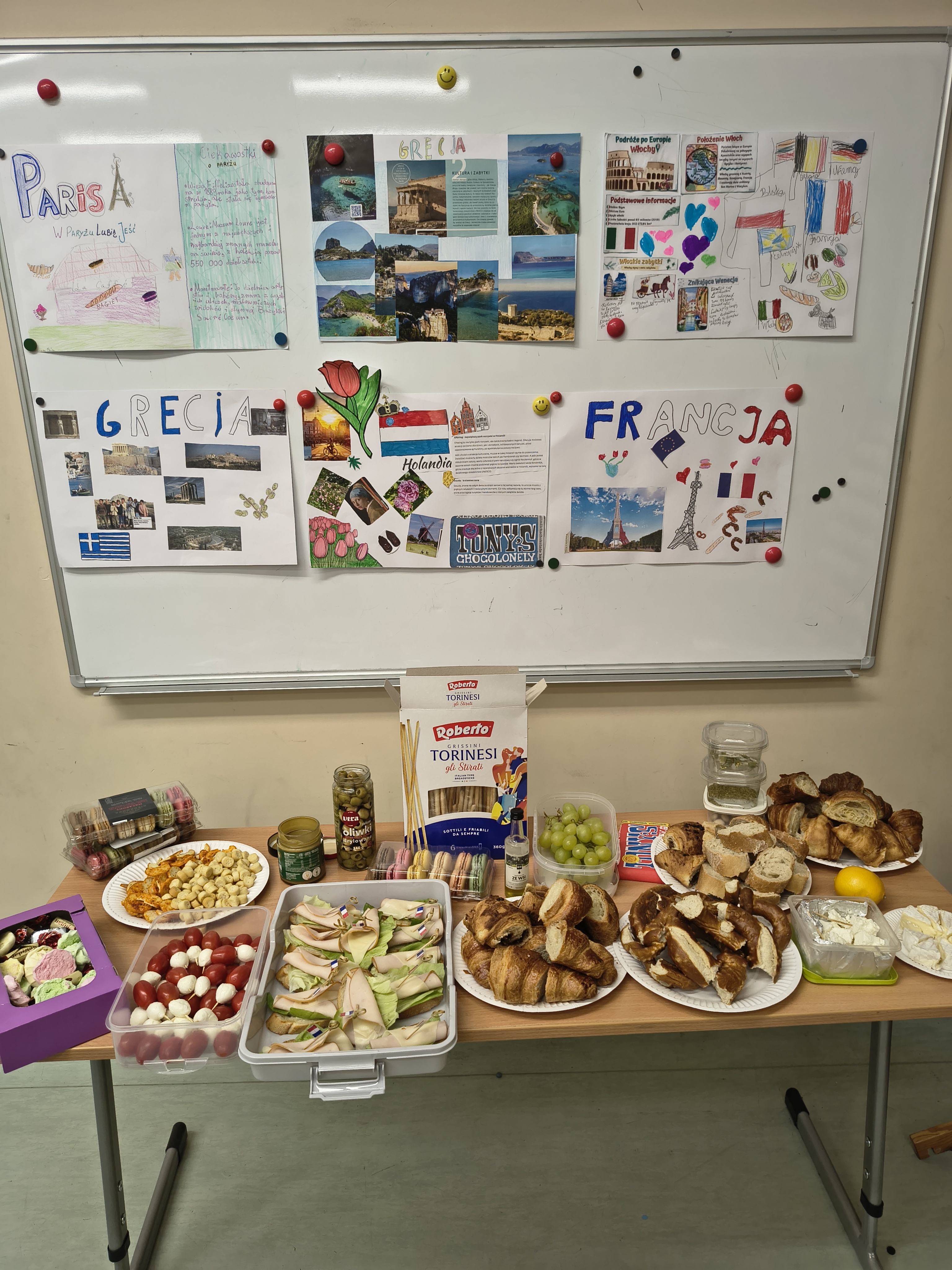 W dniach 12-15 stycznia 2026 r. uczniowie klas trzecich, wraz z wychowawczyniami - panią Eweliną Król i panią Ewą Nadwodną, uczestniczyli w zajęciach pod hasłem „Polska w Europie”. Interaktywne lekcje miały na celu poznanie hymnu, flagi oraz państw członkowskich Unii Europejskiej. Dzieci z kl. 3a wykonały w grupach plakaty z informacjami o wybranym przez siebie kraju. Zwieńczeniem było przygotowanie przez uczniów „europejskiego stołu”, na którym królowały: sery, bagietki, rogaliki, precle, kanapki, oliwki oraz oliwa. Uczniowie oglądali także hiszpańskie tańce i słuchali włoskiej muzyki. Z kolei dzieci z kl. 3b poznawały kraje europejskie poprzez różnorodne zabawy. Uczniowie grali w gry planszowe, układali puzzle, kolorowali flagi państw oraz „palcem po mapie” wędrowali po różnych krajach Europy. Dużym zainteresowaniem cieszyło się również oglądanie pamiątek przywiezionych z wycieczek po Europie. Na zakończenie dzieci wspólnie zaśpiewały hymn Unii Europejskiej.