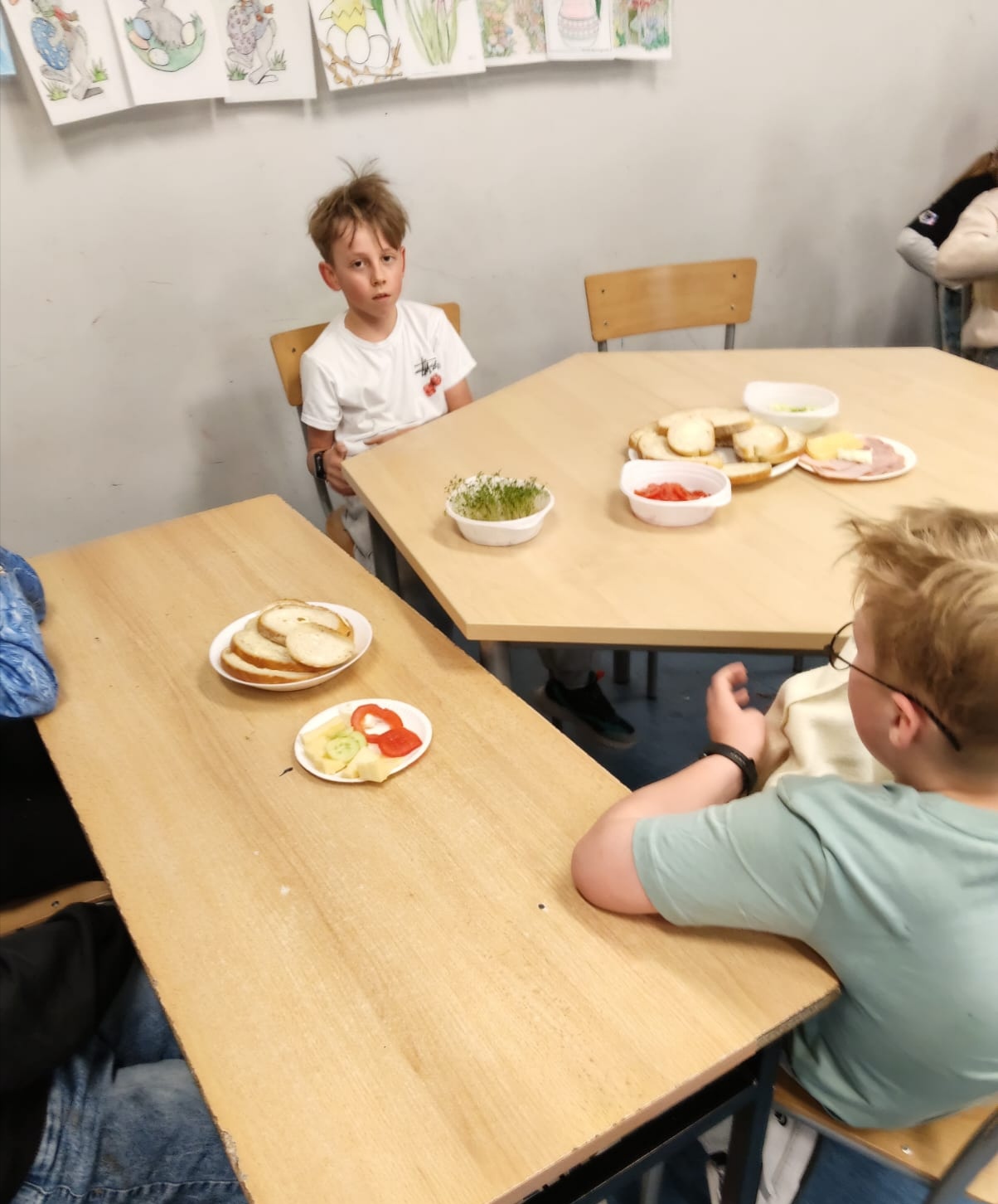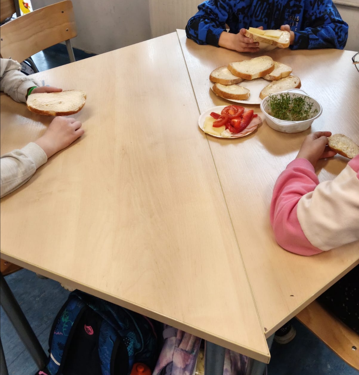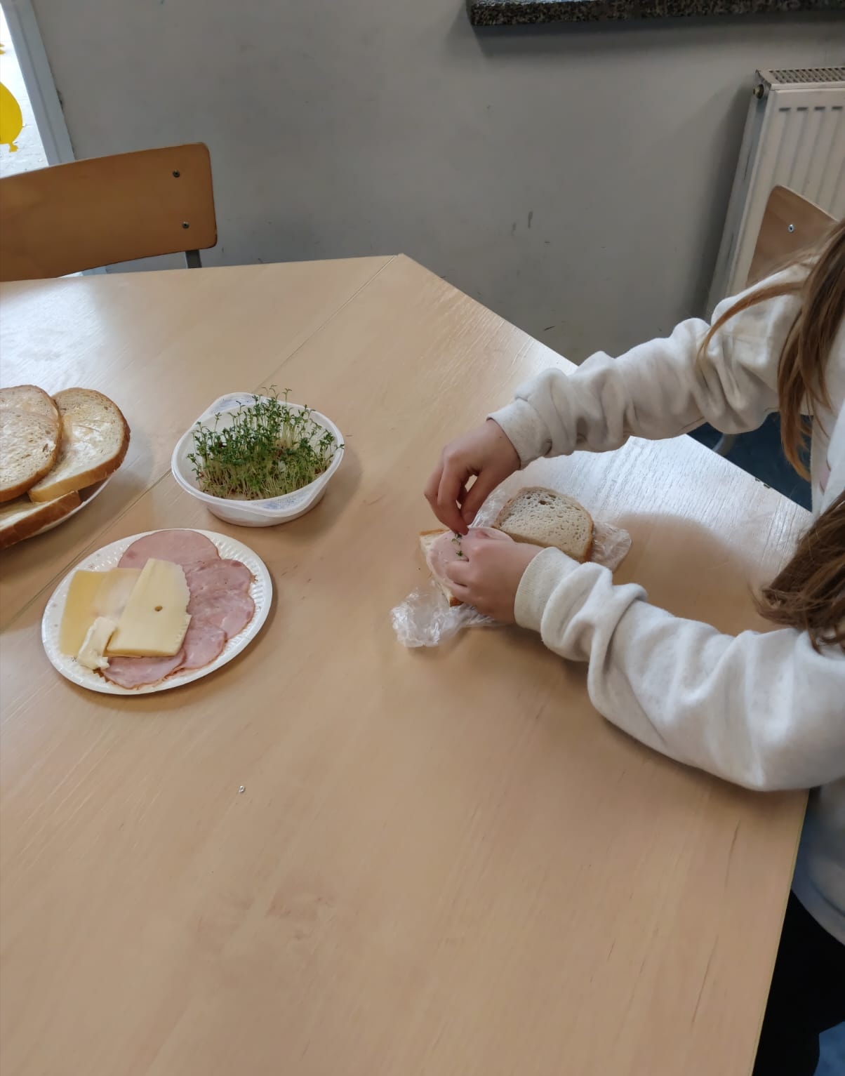 Do przygotowywania wiosennych kanapek wykorzystano wyhodowane uprzednio kiełki rzeżuchy, które wysiano wspólnie z wychowawczynią. Przypomniano również uczniom o konieczności systematycznego nawadniania organizmu niegazowaną wodą. Zwrócono też szczególną uwagę na negatywną rolę soli, która występuje w przetworzonej żywności.