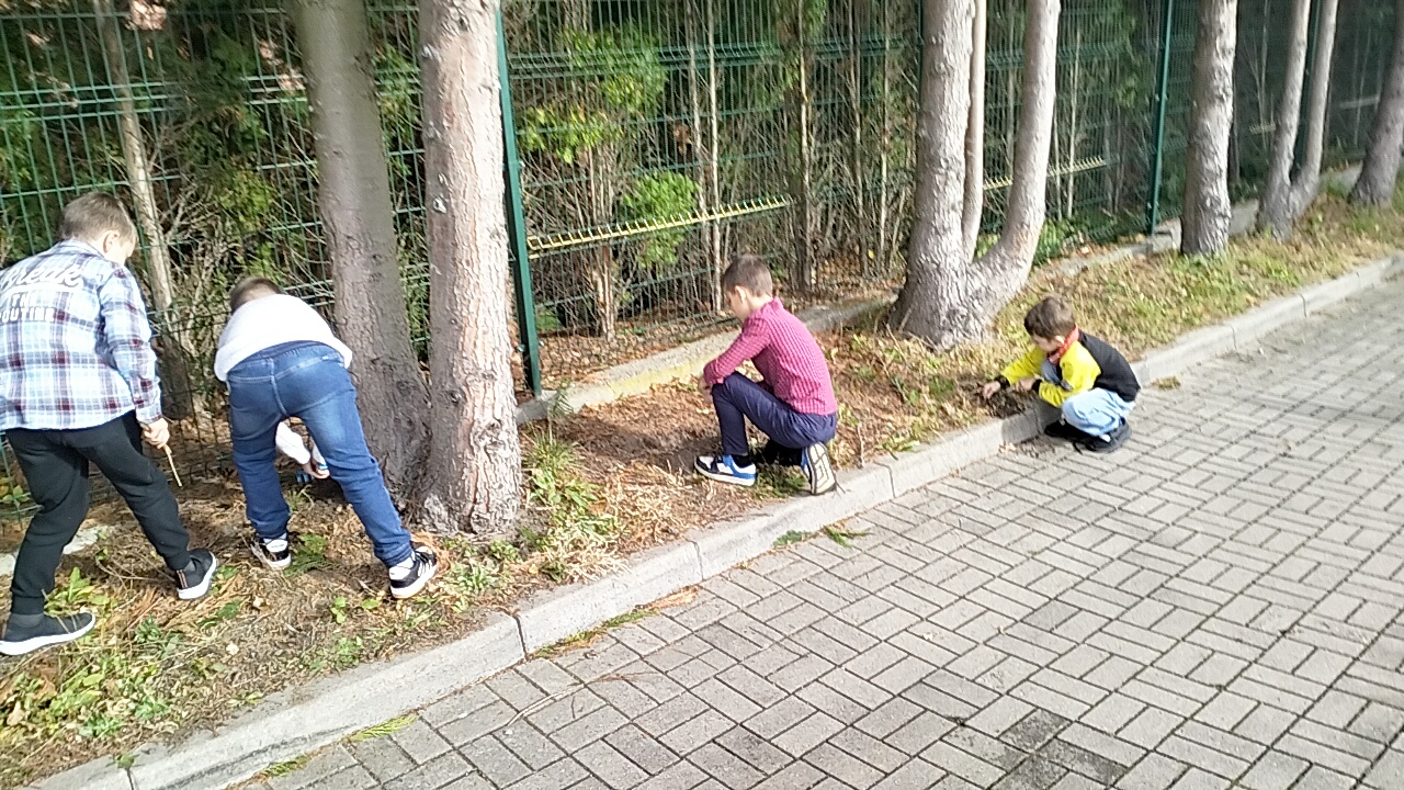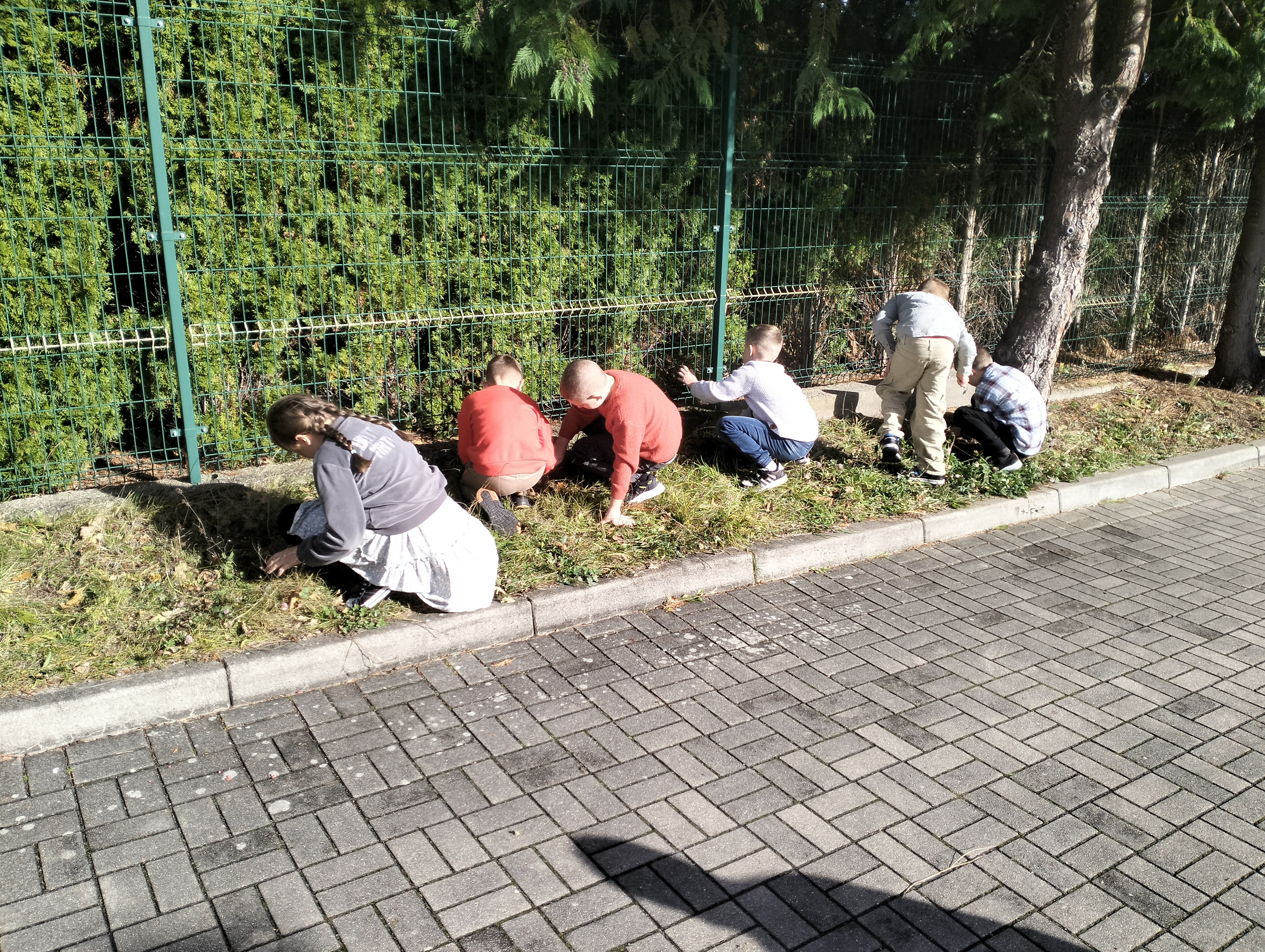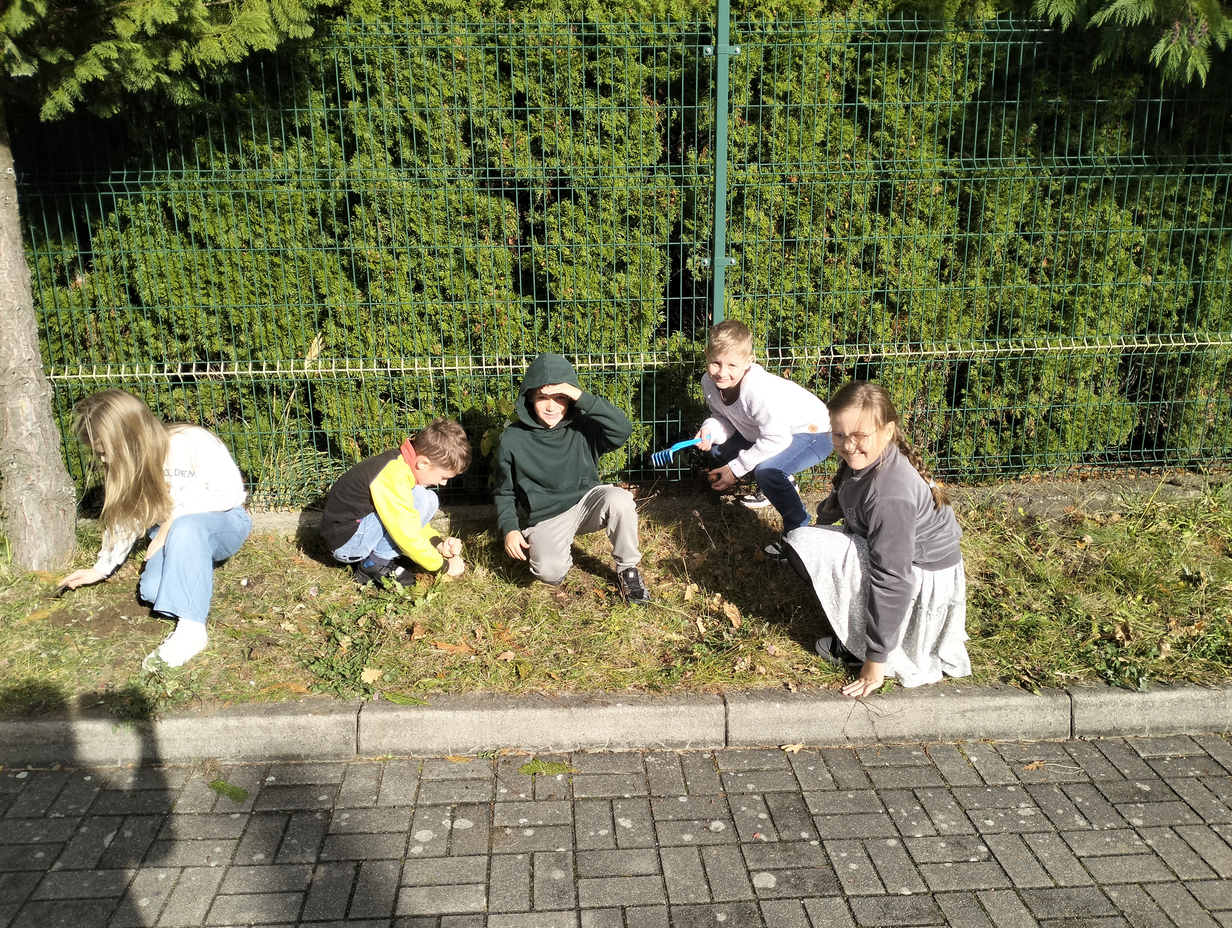 W czasie słonecznej pogody dzieci sadziły cebulki kwiatów na podwórku szkolnym.