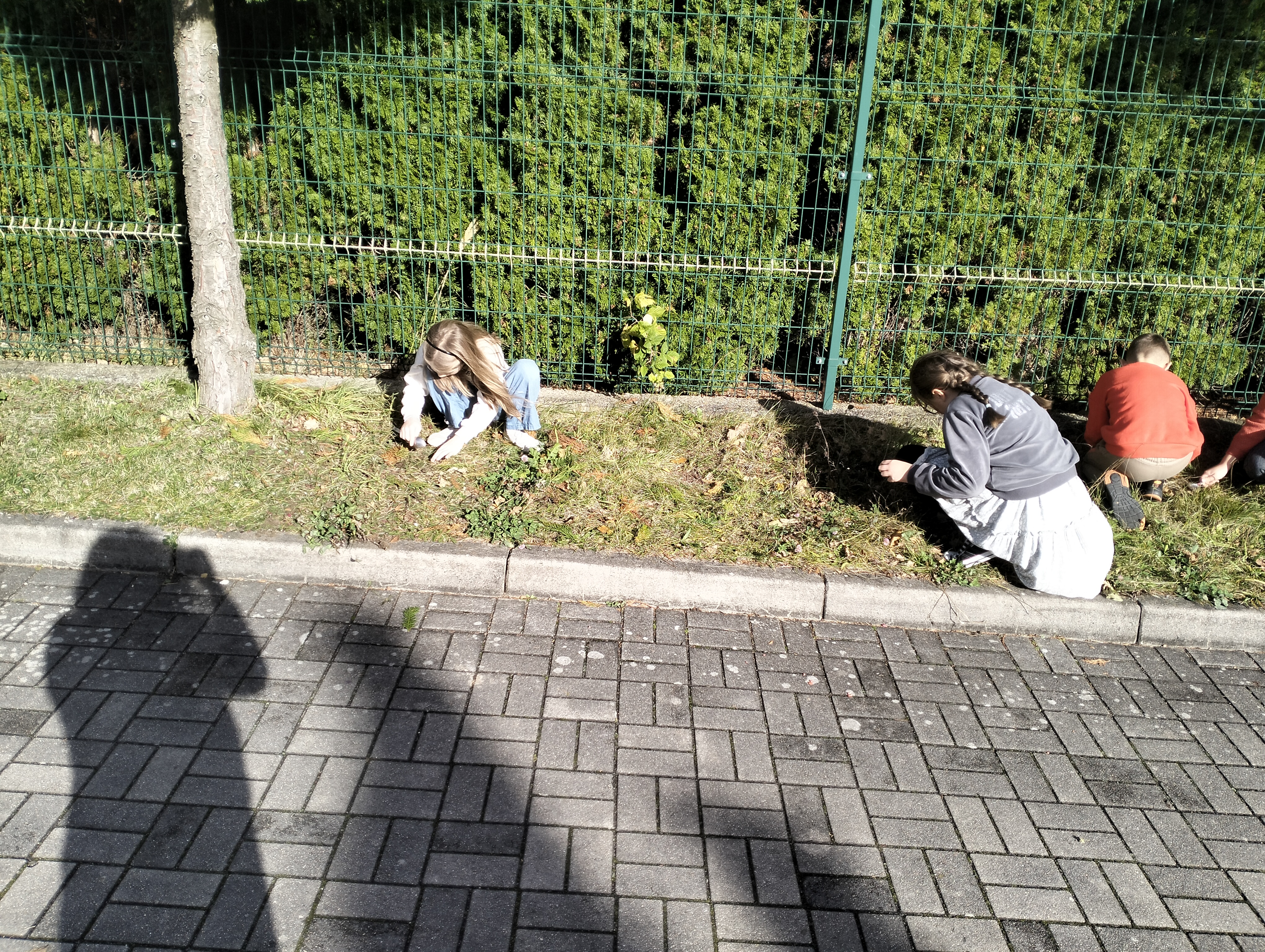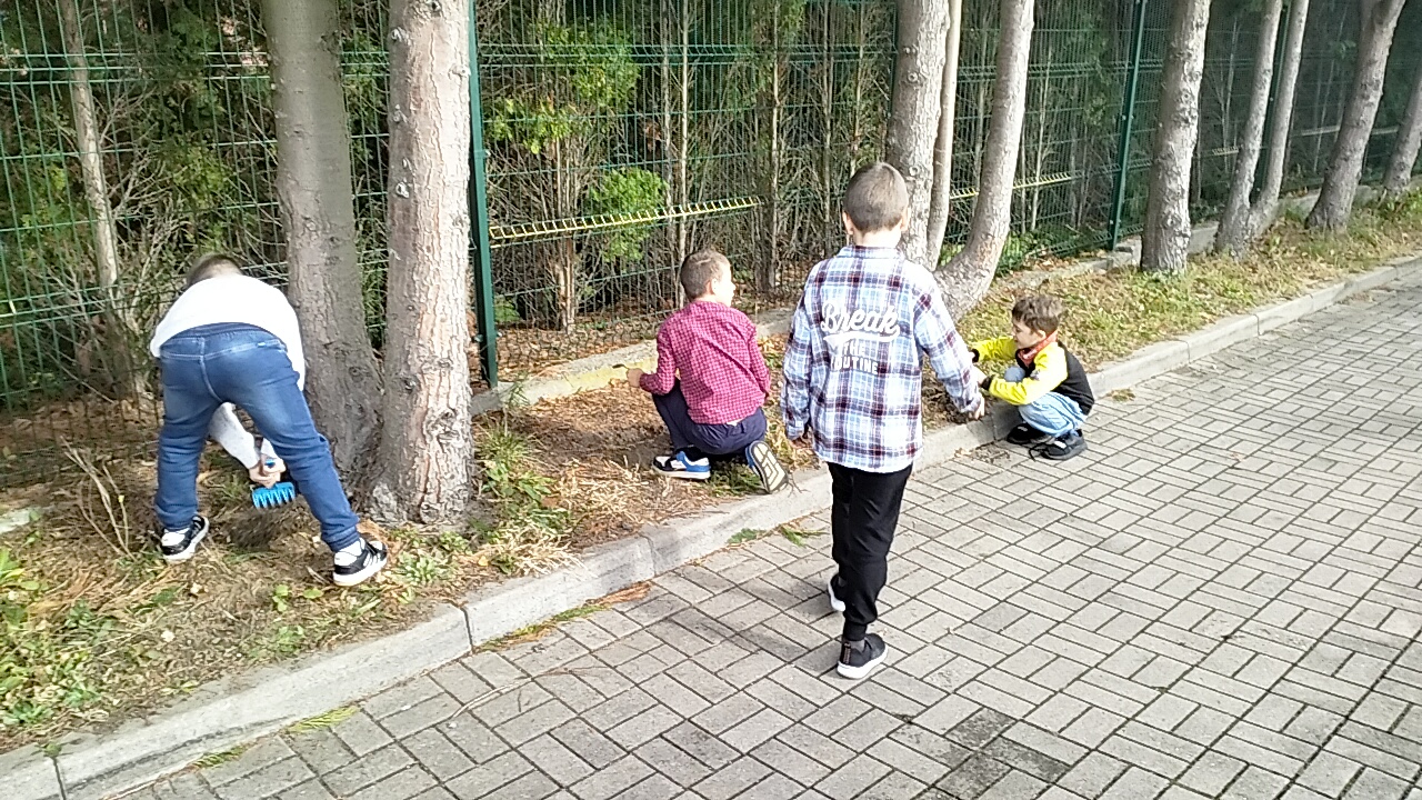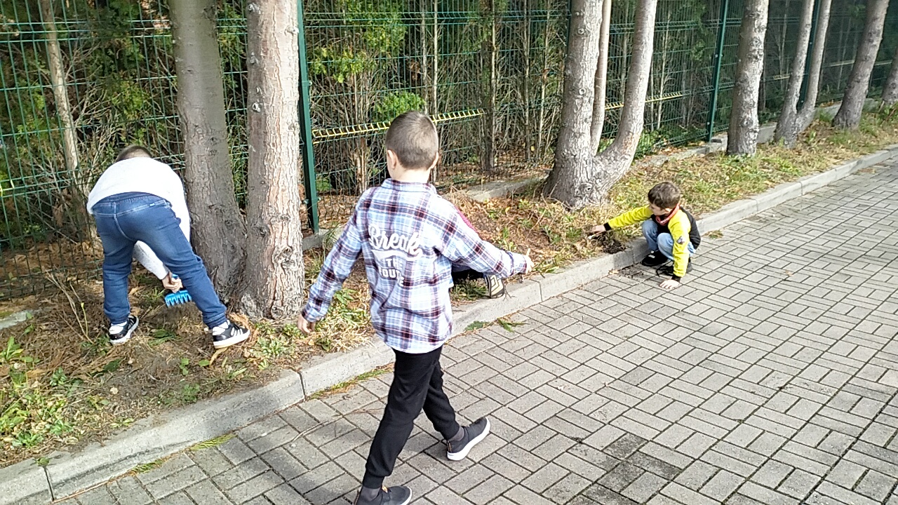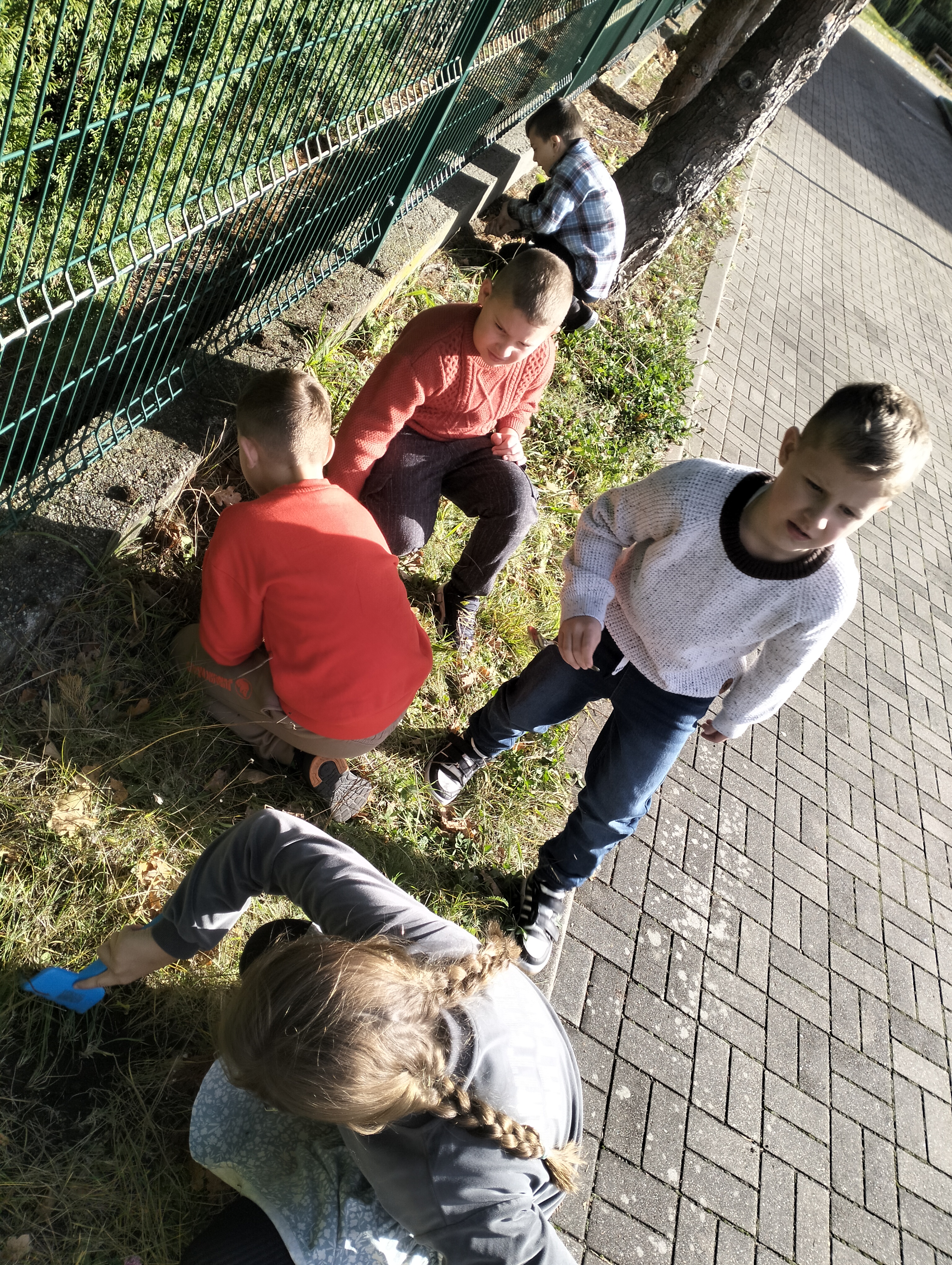 W czasie słonecznej pogody dzieci sadziły cebulki kwiatów na podwórku szkolnym.