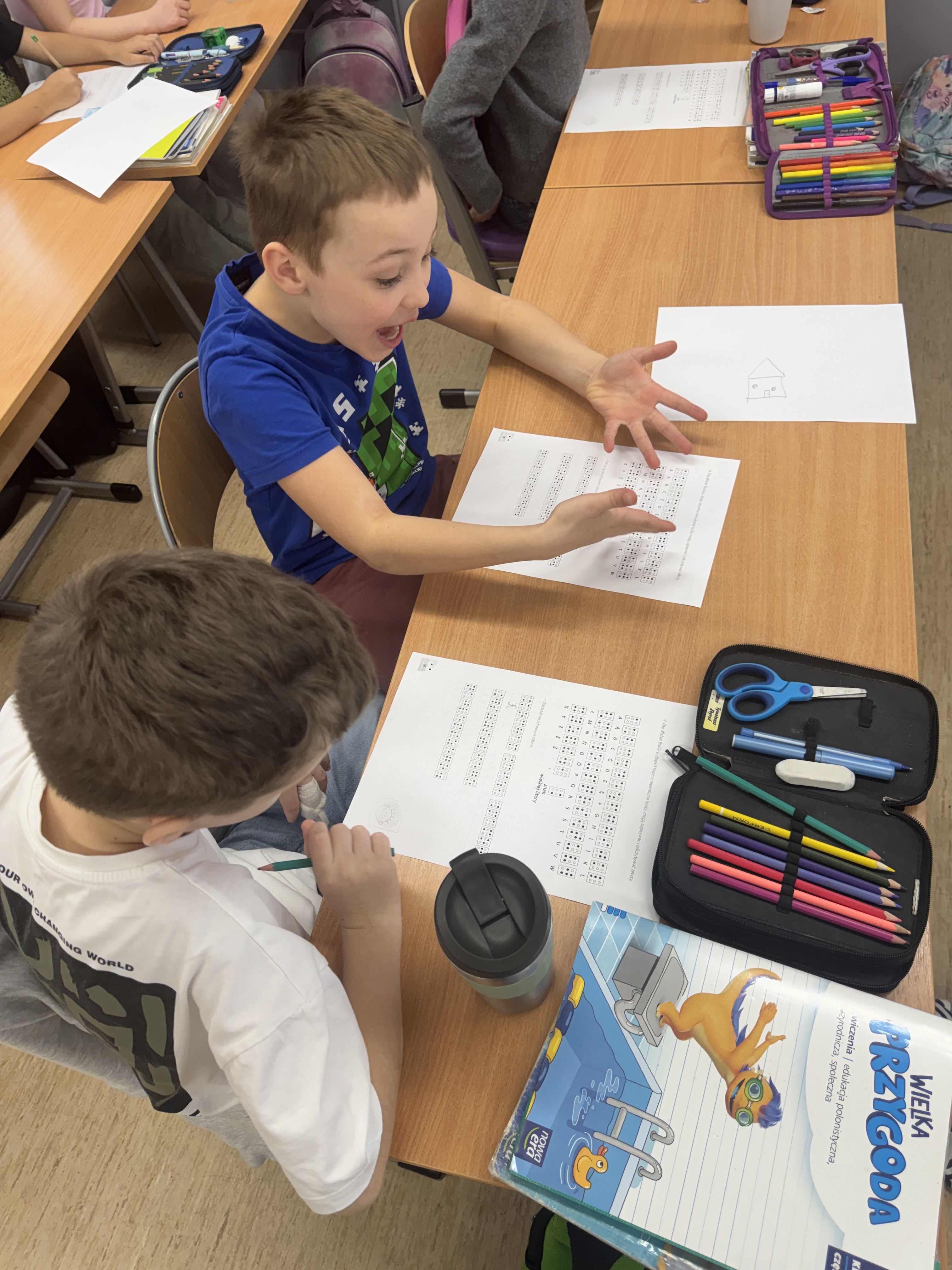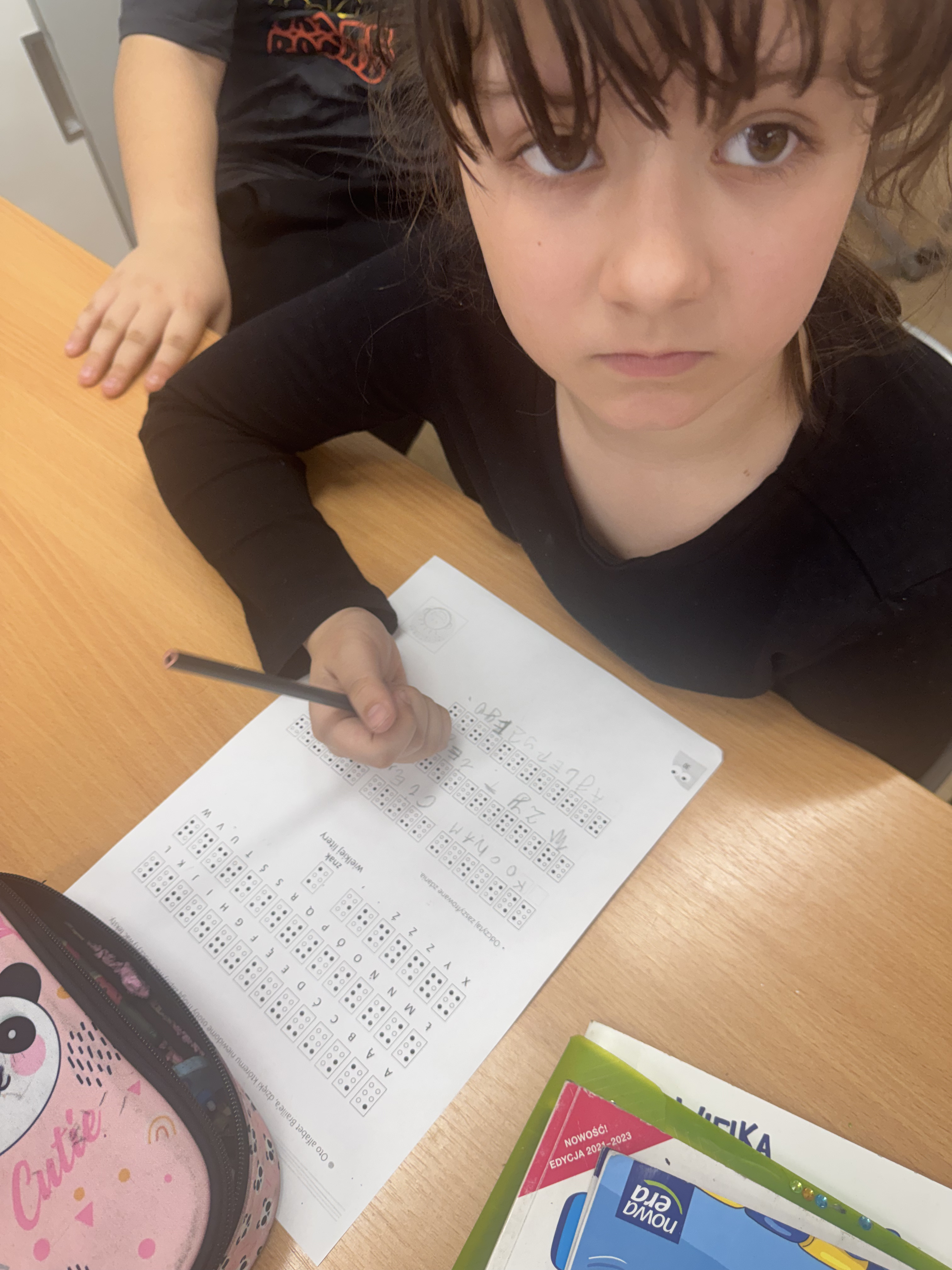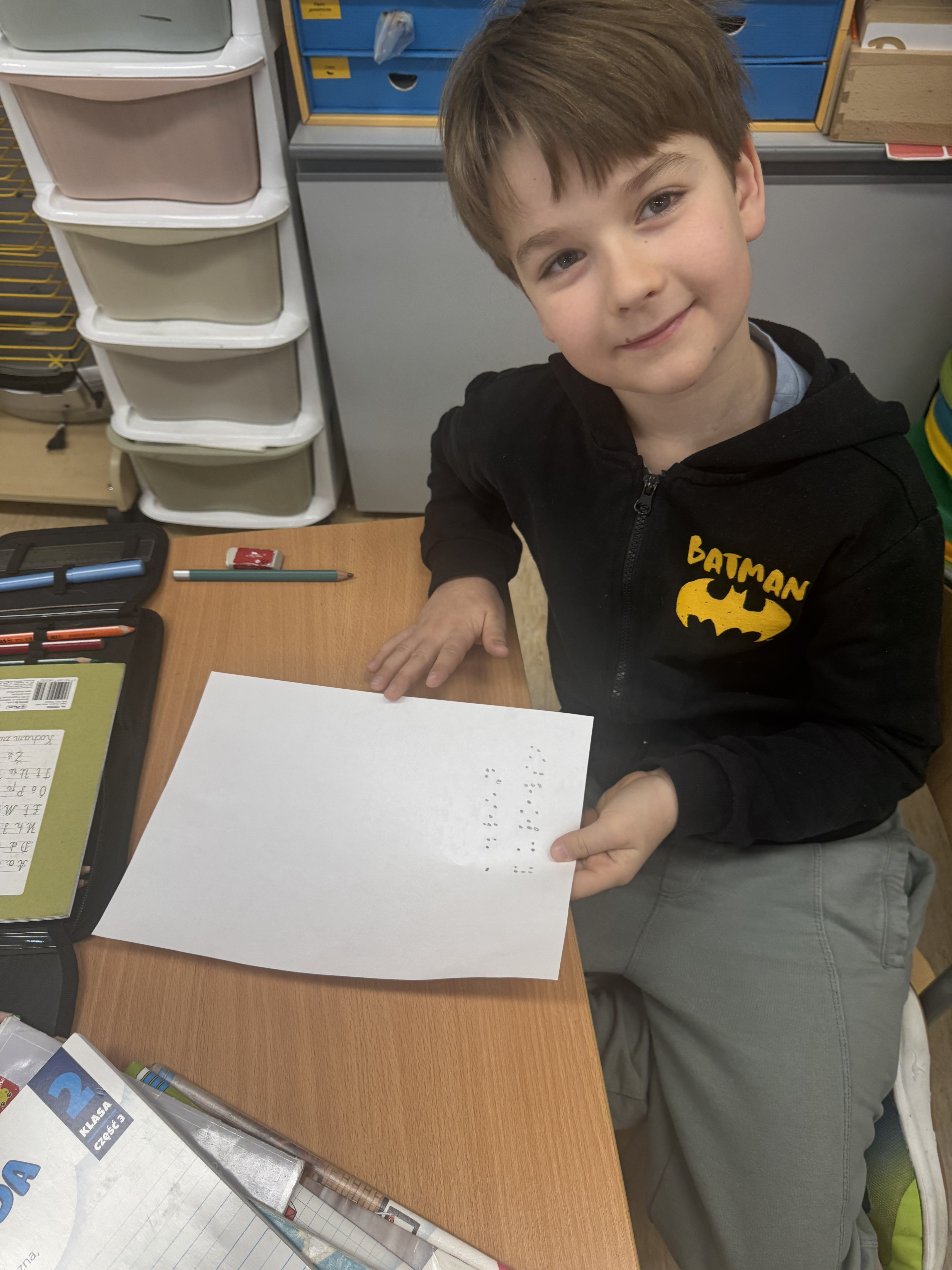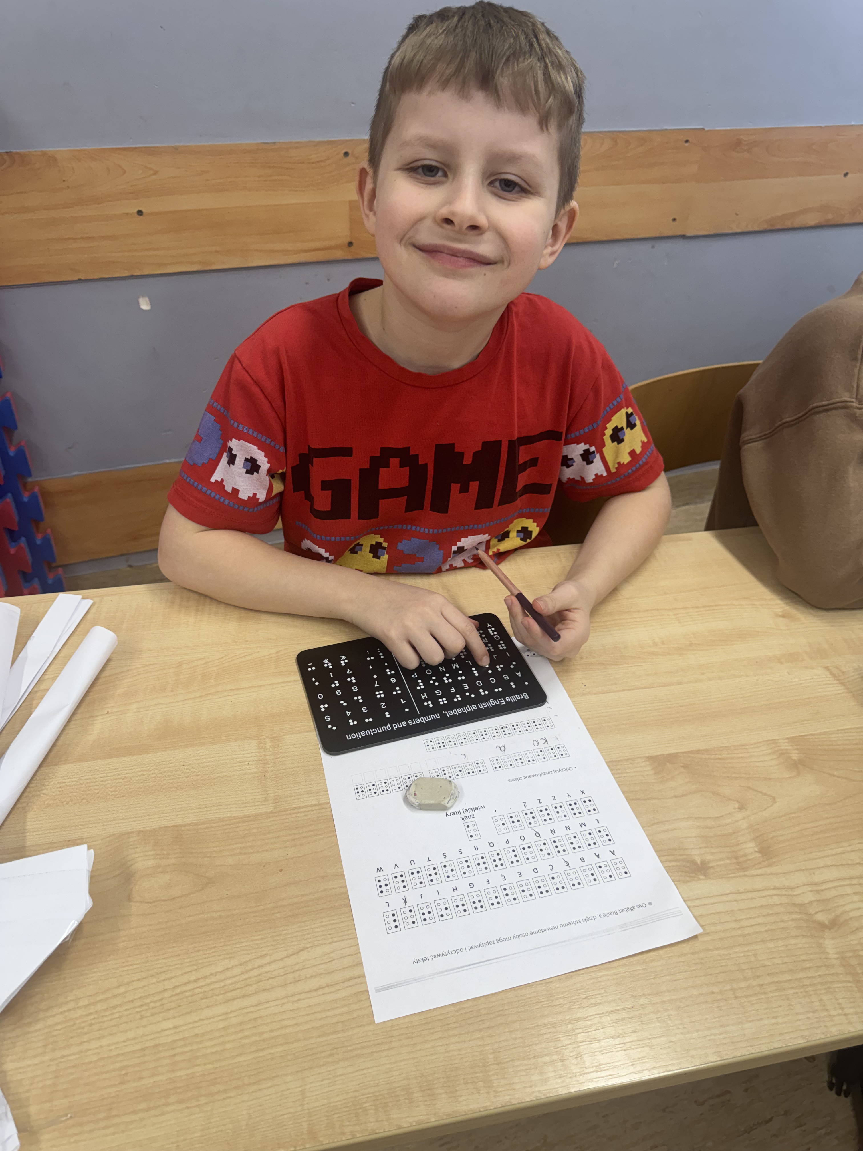 Na zakończenie zajęć każde dziecko podpisało się swoim imieniem zapisanym w alfabecie Braille’a, co było ciekawym i angażującym doświadczeniem. Dzięki tym działaniom uczniowie rozwijali empatię, wrażliwość społeczną oraz poszerzali swoją wiedzę o sposobach komunikacji osób niewidomych.