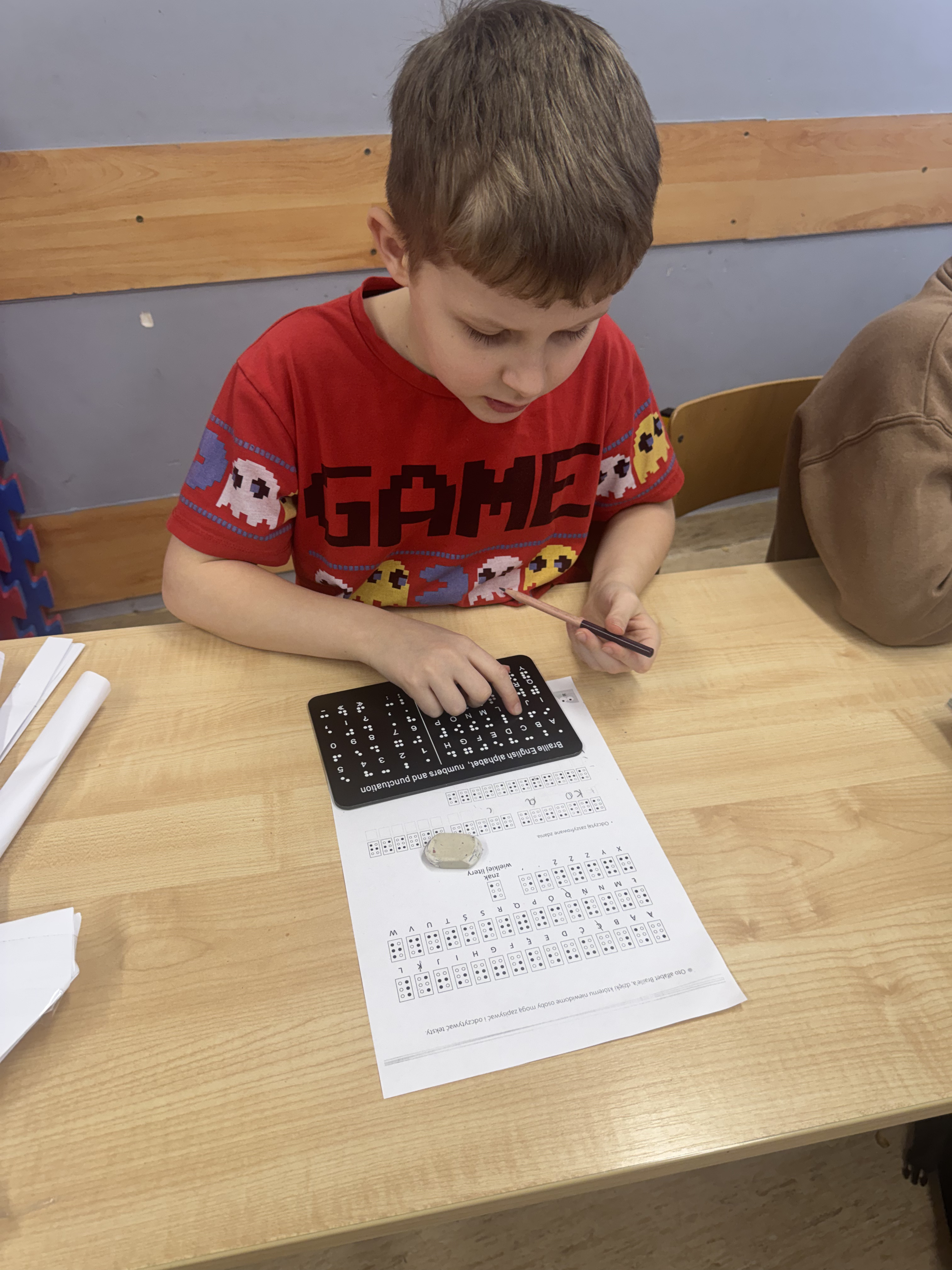 Podczas zajęć uczniowie poznali alfabet Braille’a - jego historię, zasady zapisu oraz znaczenie w życiu osób z niepełnosprawnością wzroku. Następnie mieli okazję rozszyfrować zdanie zapisane alfabetem Braille’a, co pozwoliło im lepiej zrozumieć, jak wygląda proces czytania dotykiem.