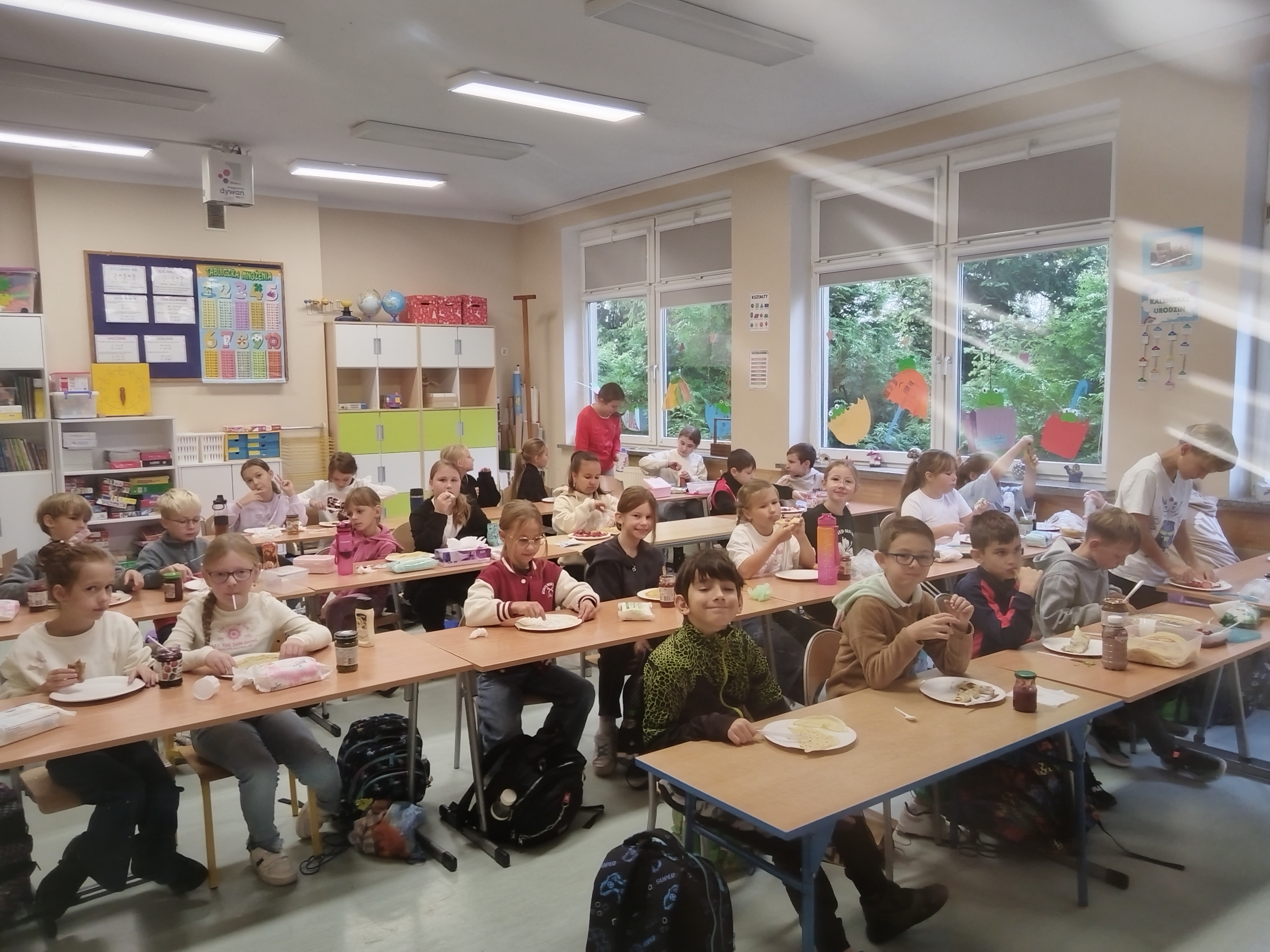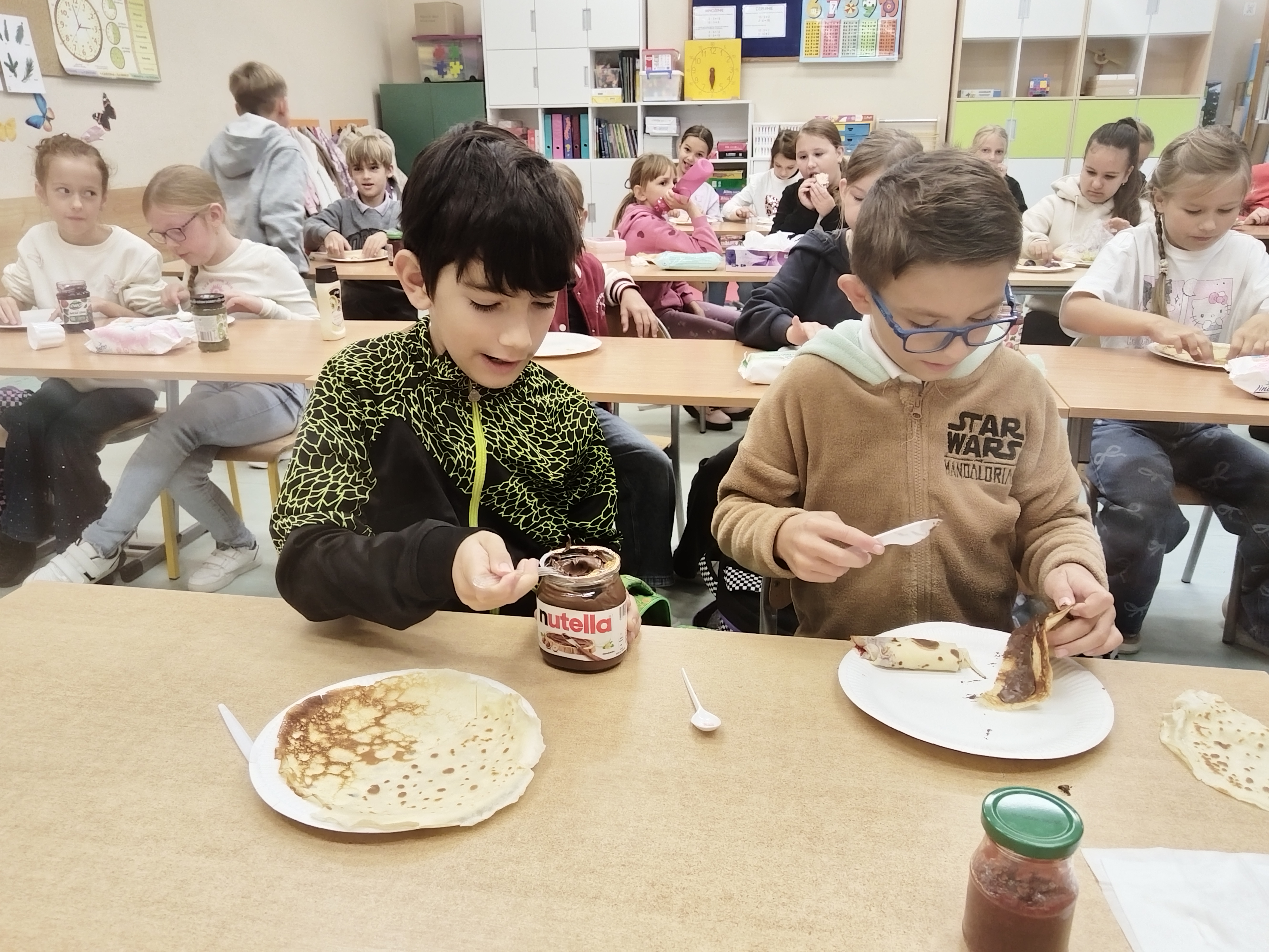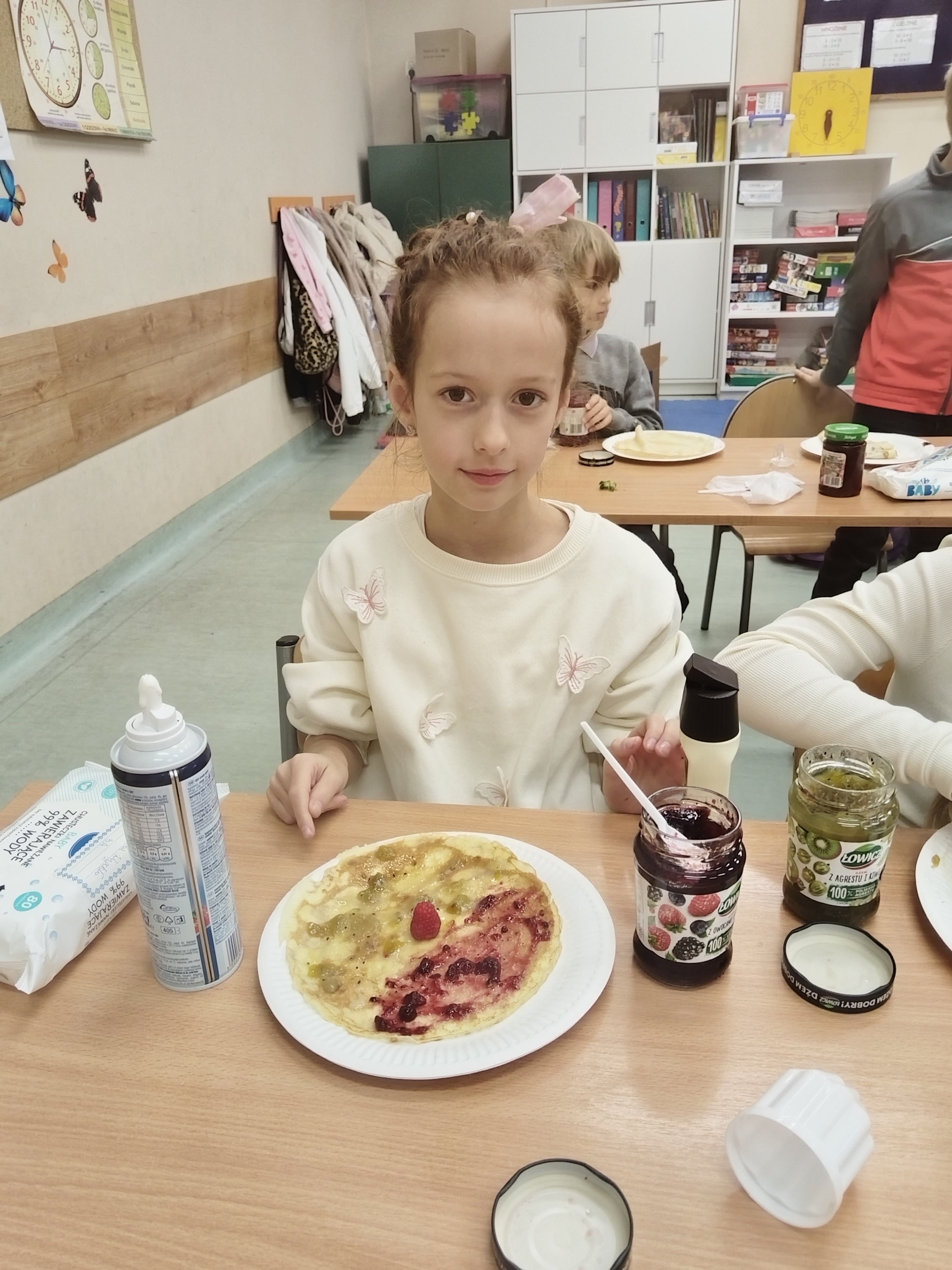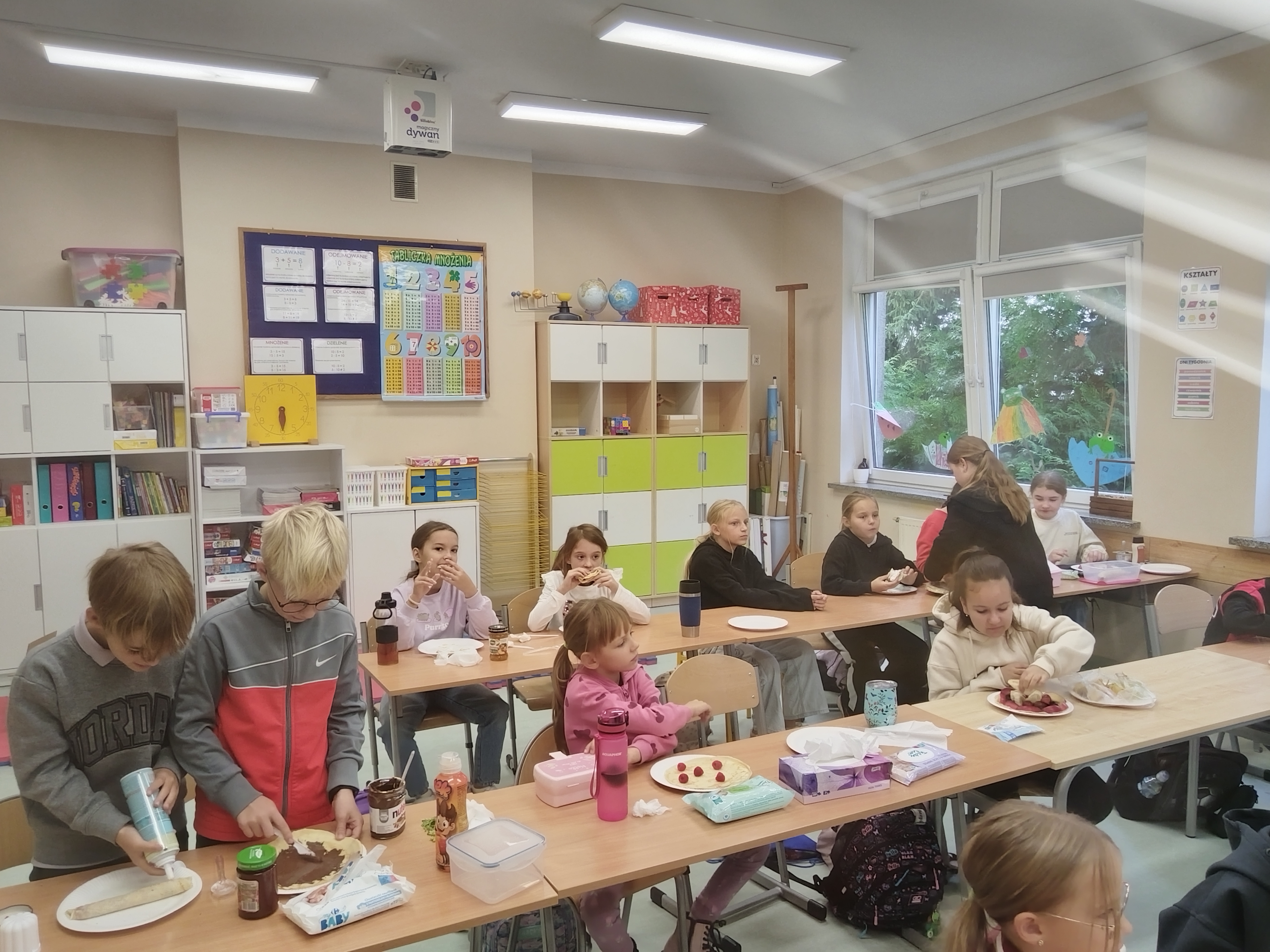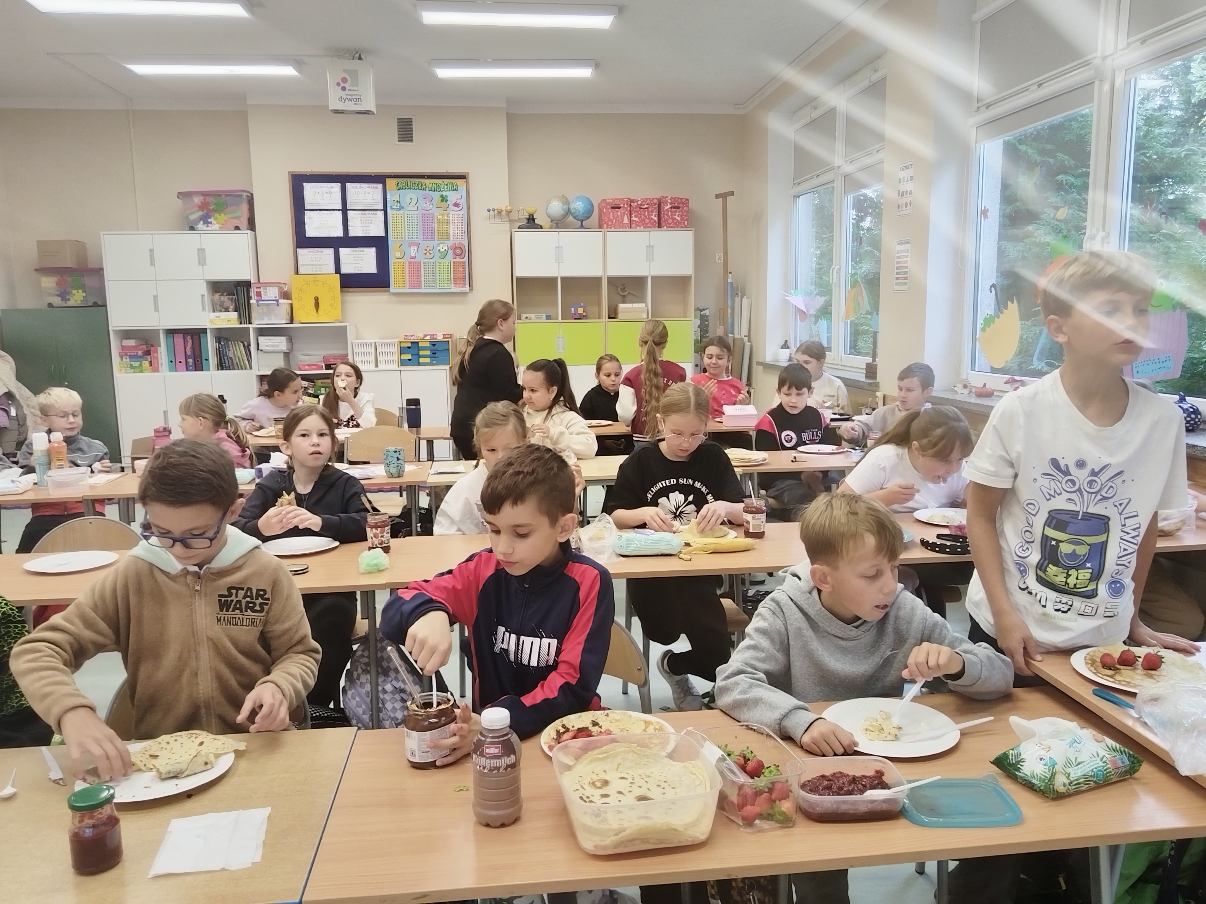 Kto powiedział, że w szkole może być nudno? Uczniowie klasy 3a mają zawsze fantastyczne pomysły! W dniu 30 września 2025 r. z okazji Dnia Chłopaka dzieci przygotowały pyszne naleśniki. Wśród owoców królowały truskawki, banany i maliny. Wszyscy chętnie jedli rozmaite dżemy i inne słodkości. Bardzo dziękujemy rodzicom za zaangażowanie.