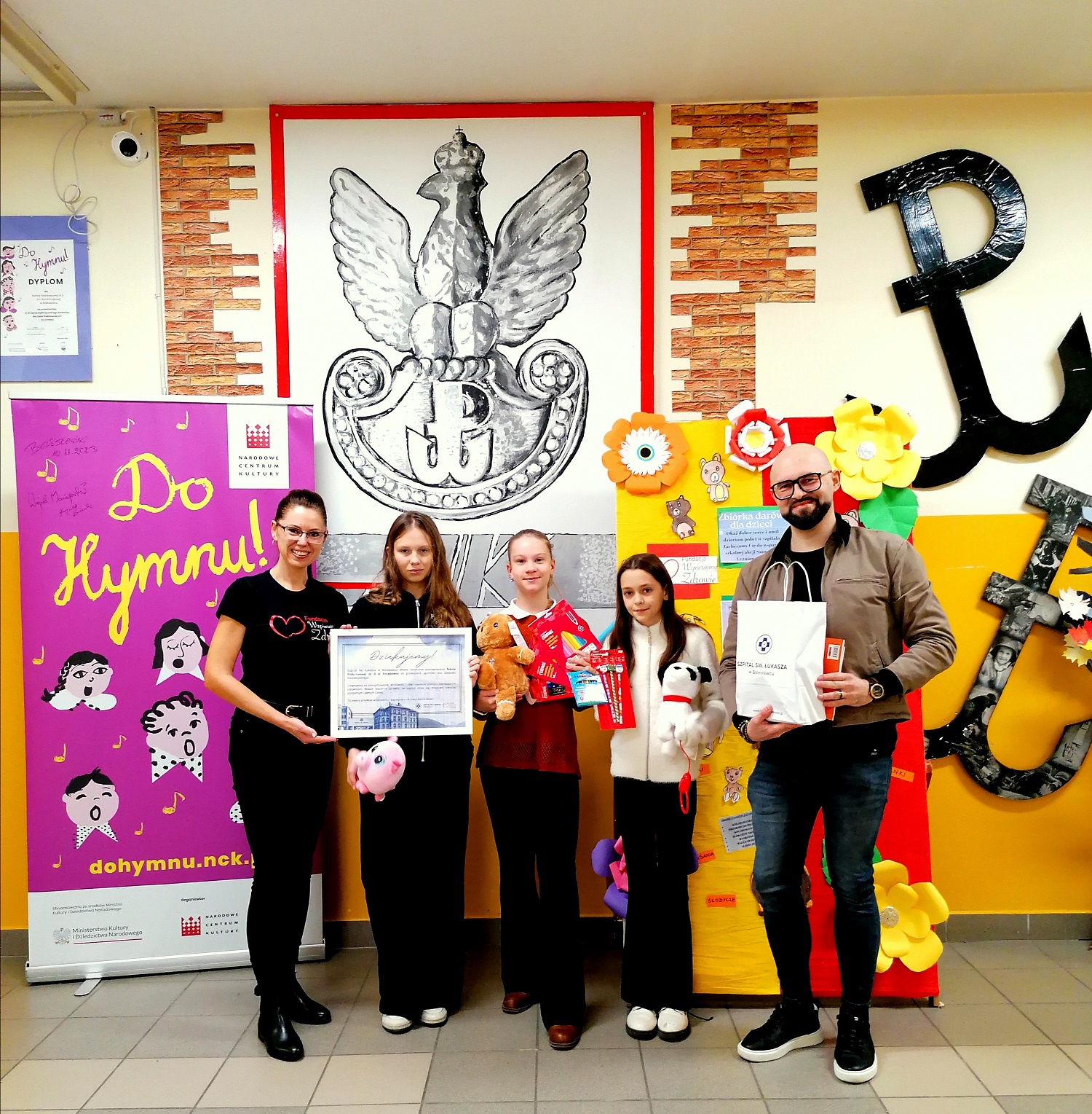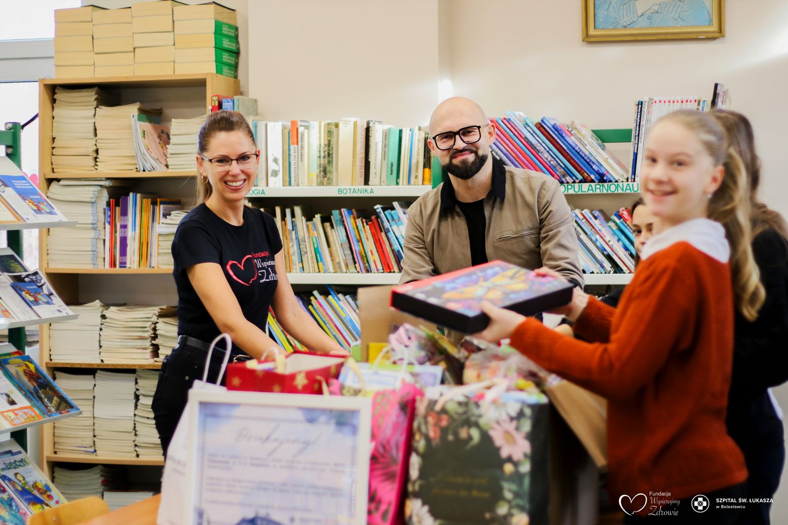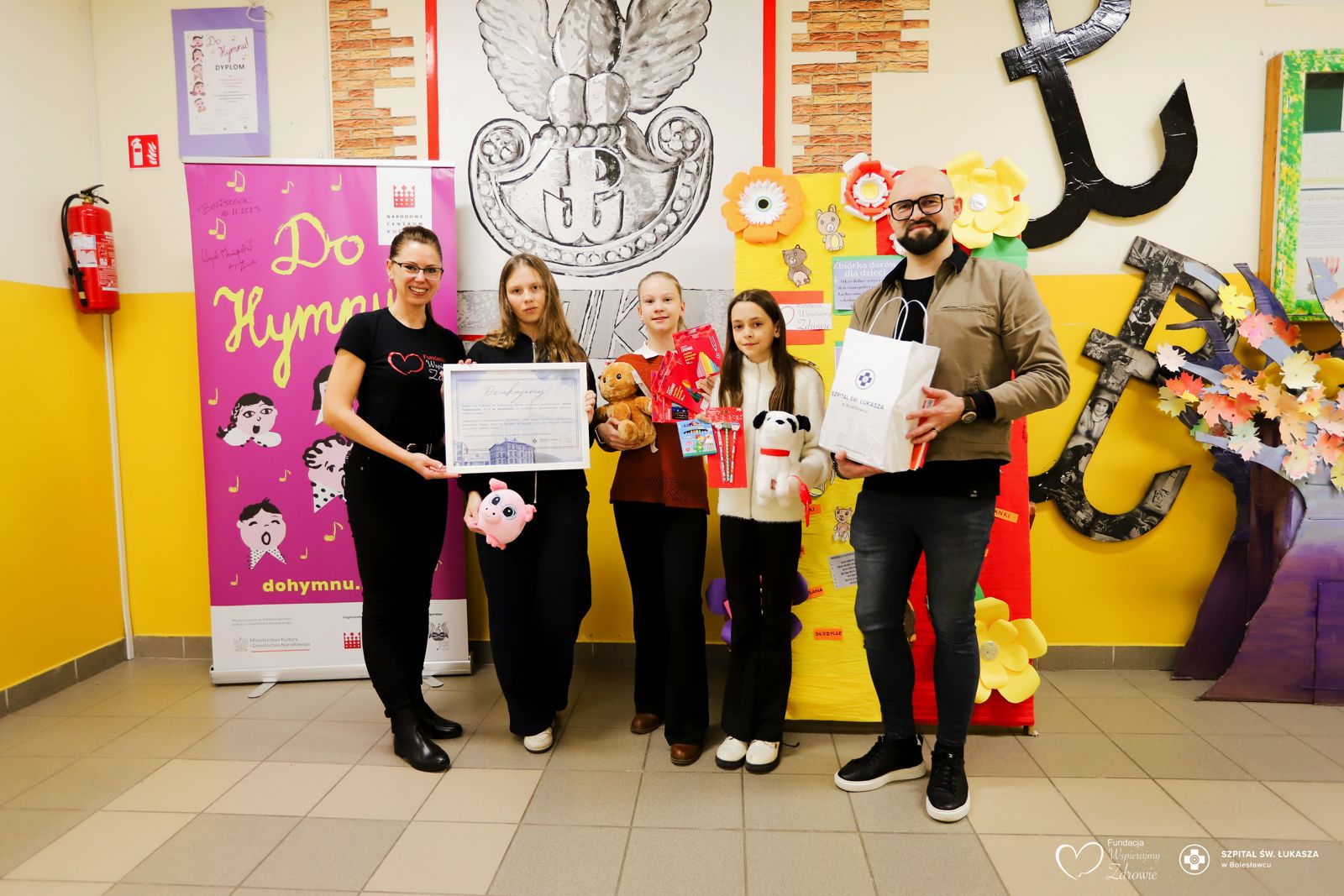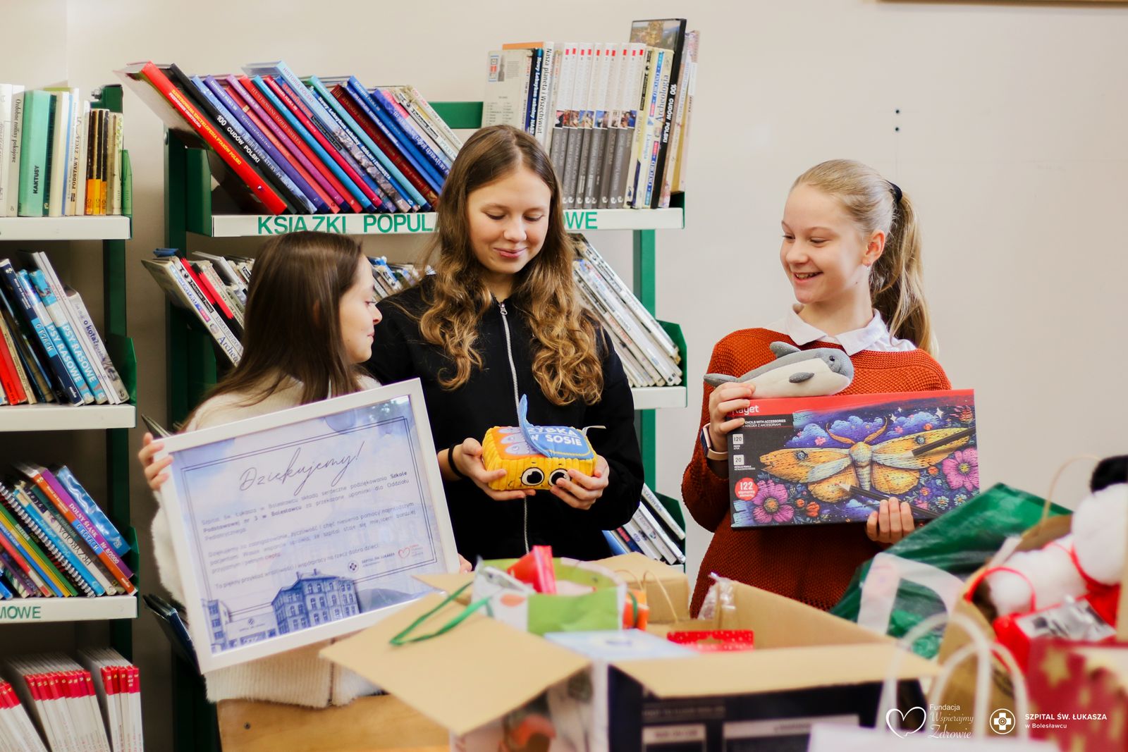 Dnia 13 listopada 2025 r. prezes Fundacji „Wspierajmy Zdrowie” w Bolesławcu - pani Jolanta Sawczak, w obecności przedstawicieli Rady Samorządu Uczniowskiego - Agaty Koryckiej, Antoniny Roli, Julii Zdunek oraz opiekuna SU - pana Adriana Banysia, złożyła podziękowanie w imieniu Szpitala św. Łukasza dla całej społeczności szkolnej za przekazane upominki dla Oddziału Pediatrycznego oraz zaangażowanie, życzliwość i chęć niesienia pomocy najmłodszym pacjentom. To piękny przykład wrażliwości oraz współpracy na rzecz dobra dzieci.