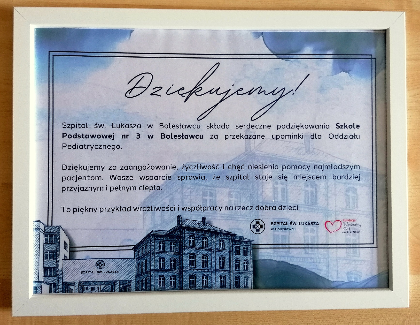 Jest nam niezmiernie miło ogłosić, iż Szkoła Podstawowa nr 3 im. Armii Krajowej w Bolesławcu otrzymała dyplom podziękowania za zbiórkę potrzebnych rzeczy dla najmłodszych pacjentów przebywających na oddziale dziecięcym w Szpitalu św. Łukasza w Bolesławcu.