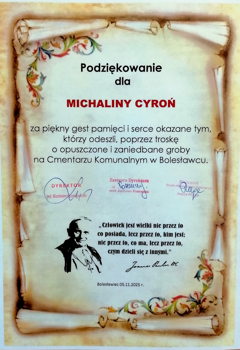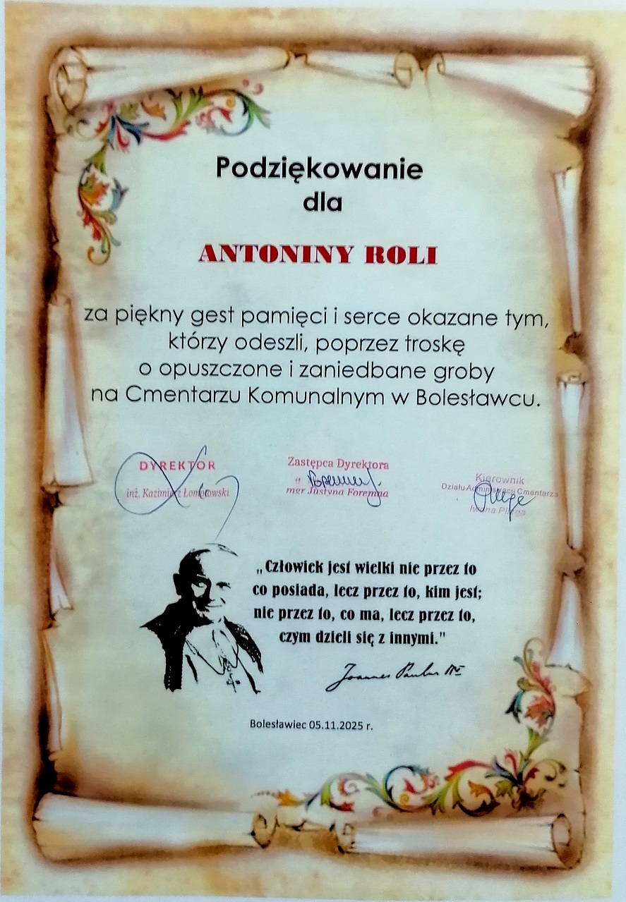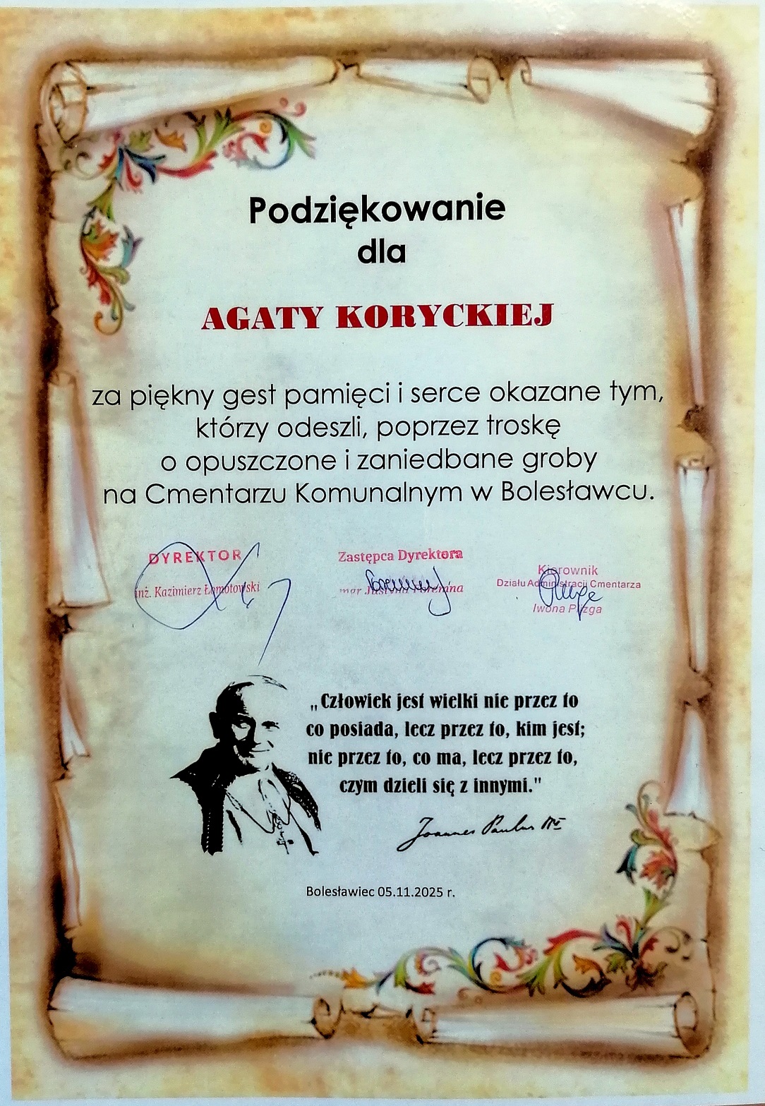 Jest nam niezmiernie miło ogłosić, iż Szkolna Rada Wolontariatu Samorządu Uczniowskiego Szkoły Podstawowej nr 3 im. Armii Krajowej w Bolesławcu otrzymała dyplom podziękowania za okazane serce, chęć oraz zaangażowanie w porządkowanie opuszczonych i zaniedbanych grobów na Cmentarzu Komunalnym w Bolesławcu. Postawa uczniów szkoły jest wyrazem szacunku dla pamięci zmarłych i pięknym przykładem troski o wspólne dziedzictwo.