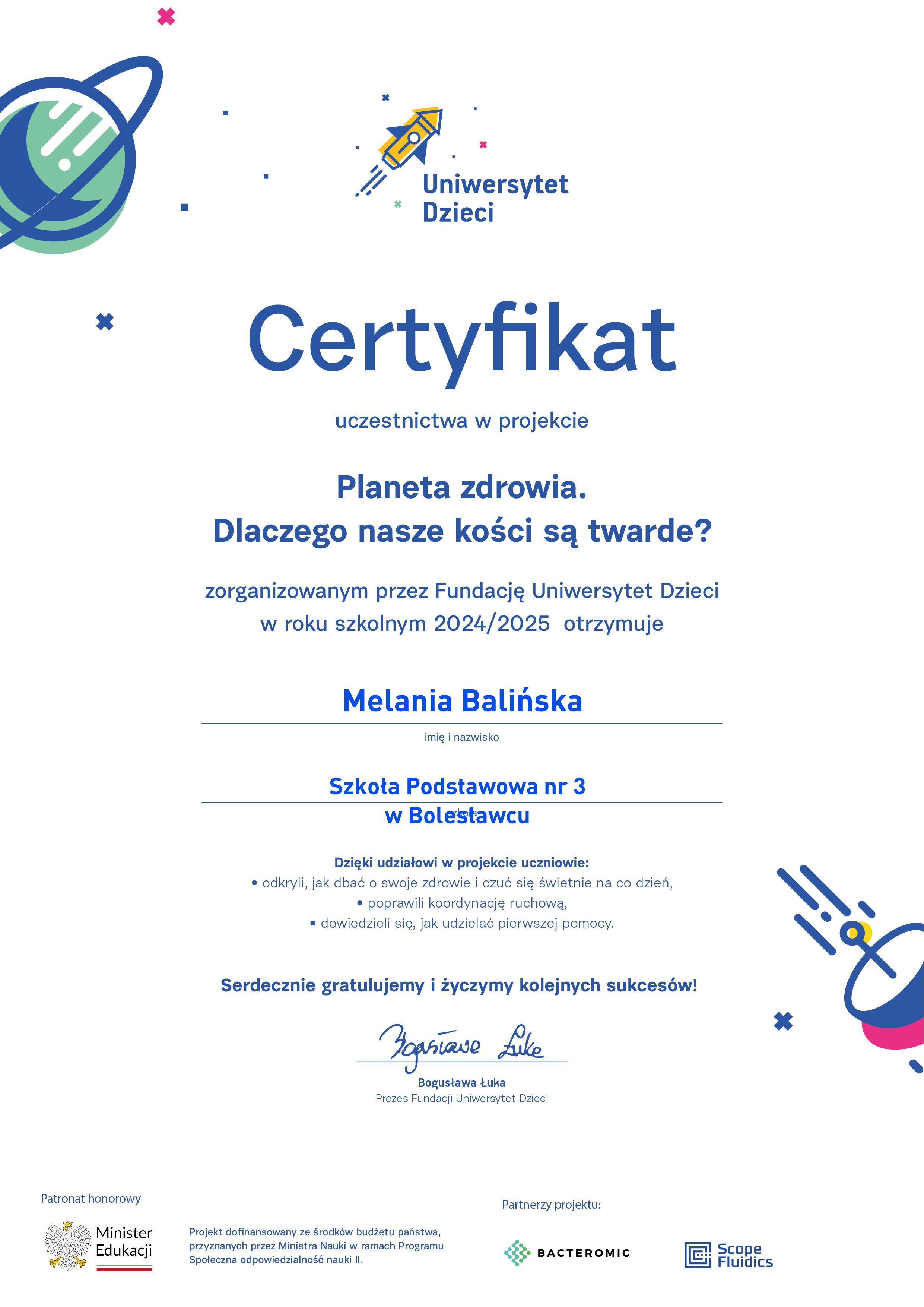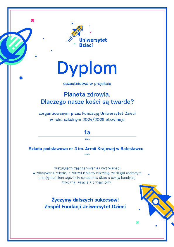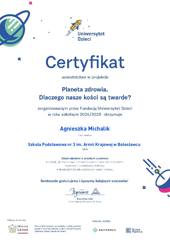 Uczniowie klas pierwszych w roku szkolnym 2024/2025 przystąpili do projektu edukacyjnego Uniwersytetu Dzieci „Planeta zdrowia. Dlaczego nasze kości są twarde?”. Podczas zajęć uczniowie odkrywali, jak dbać o swoje zdrowie. Poprzez proste doświadczenia sprawdzali, jak działa układ oddechowy oraz jak bakterie niszczą zęby. Poznali zasady zdrowego odżywiania oraz udzielania pierwszej pomocy. Przez zabawy ruchowe i ćwiczenia fizyczne dzieci dowiedziały się także, jak dbać o swoje zdrowie oraz jak organizm broni się przed wirusami i po co są kości.