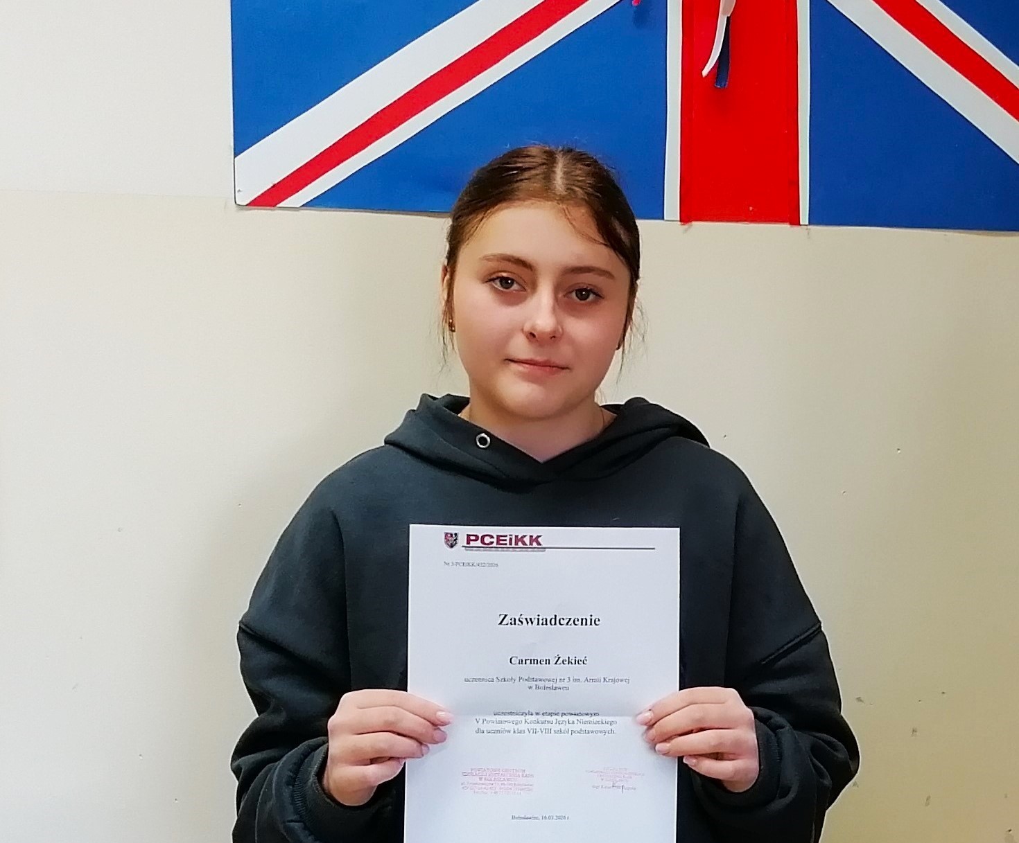 Jest nam niezmiernie miło ogłosić, iż uczennica Szkoły Podstawowej nr 3 w Bolesławcu - Carmen Żekieć z kl. 8a uzyskała tytuł laureatki II miejsca w V Powiatowym Konkursie Języka Niemieckiego.