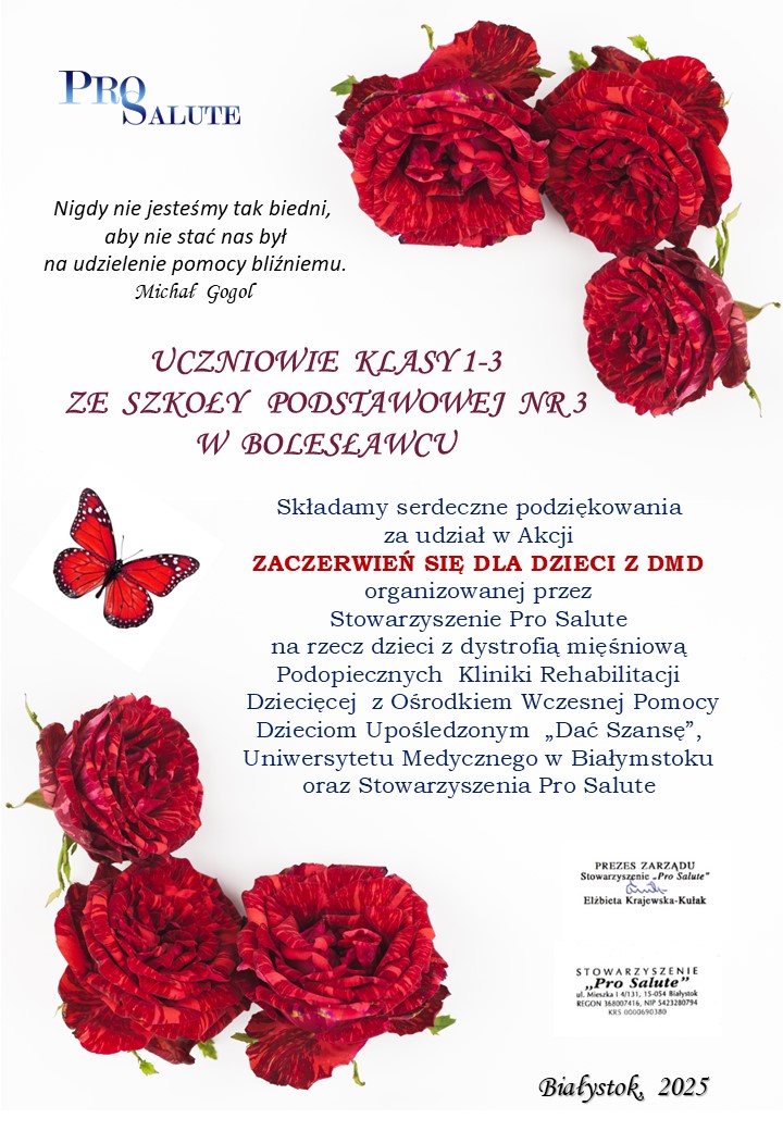 W dniu 05 września 2025 r. uczniowie klas I–III Szkoły Podstawowej nr 3 im. Armii Krajowej w Bolesławcu po raz kolejny wzięli udział w wyjątkowej akcji solidarnościowej „Zaczerwień się dla dzieci z DMD”, której celem było zwiększenie świadomości na temat dystrofii mięśniowej Duchenne’a (DMD) – poważnej, postępującej choroby mięśni, dotykającej głównie chłopców. Tego dnia dominującym kolorem był czerwony – uczniowie przyszli ubrani w czerwone koszulki, bluzy, spódniczki czy czapki, by symbolicznie okazać swoje wsparcie dzieciom zmagającym się z tą rzadką chorobą.
