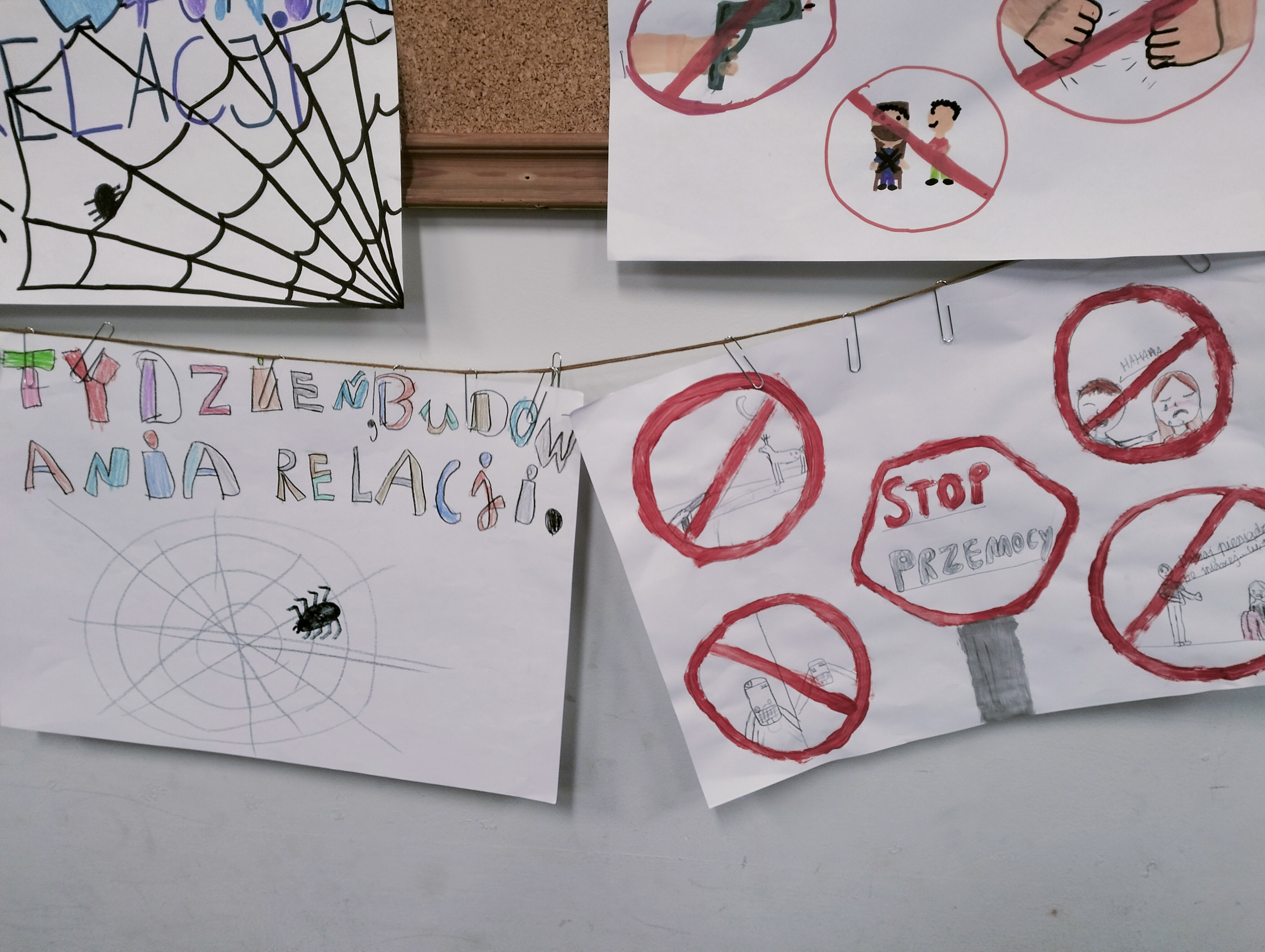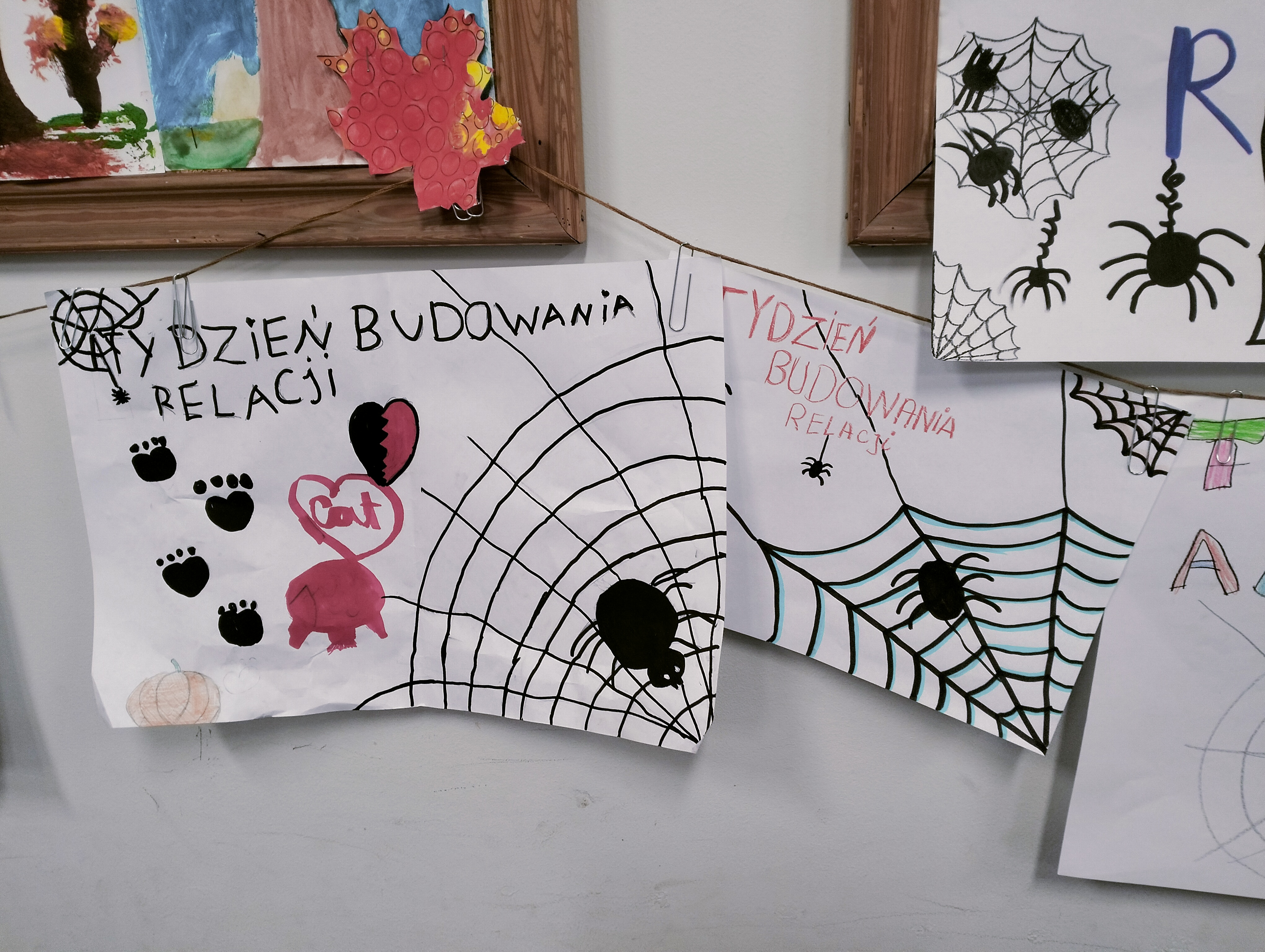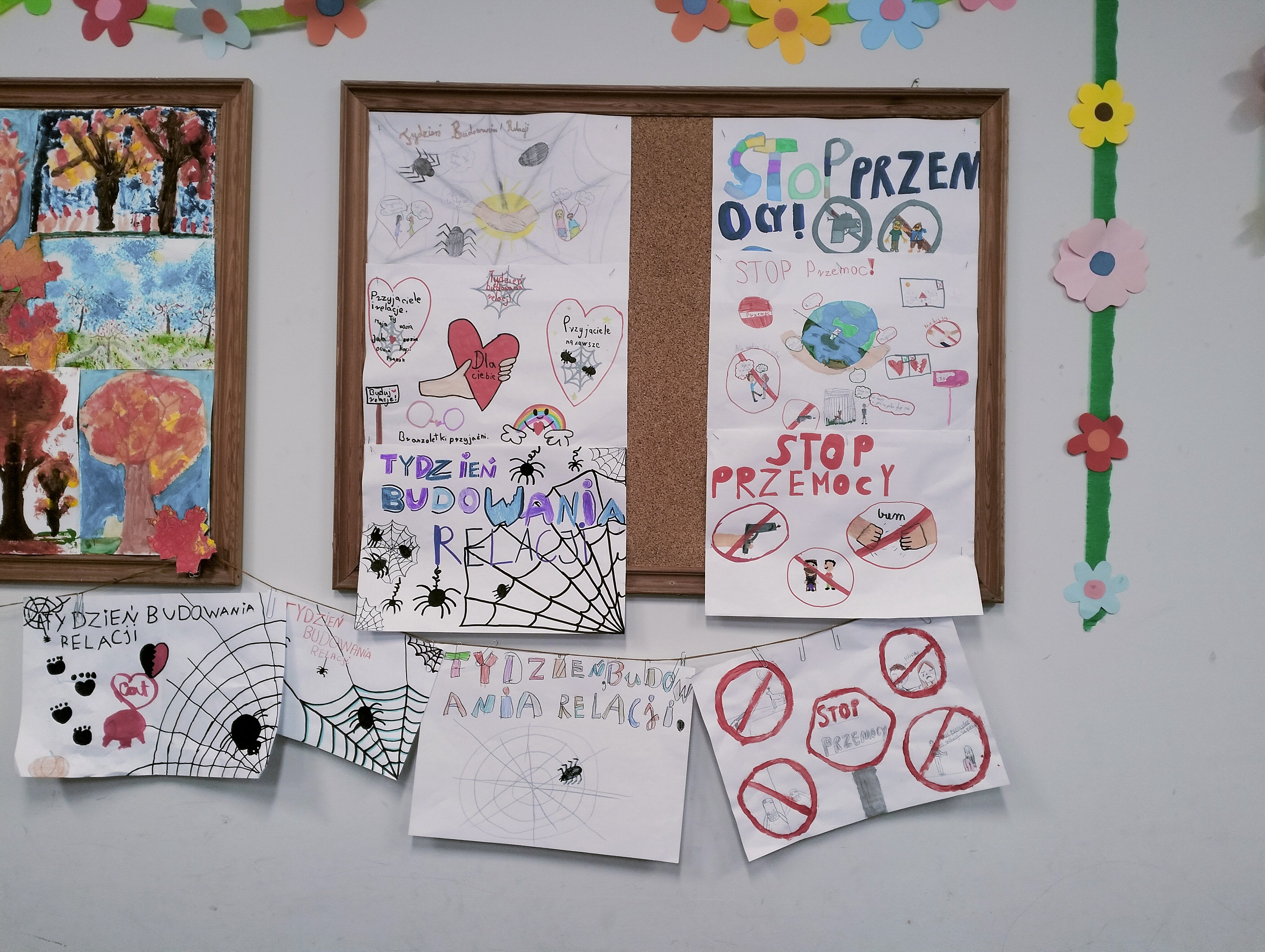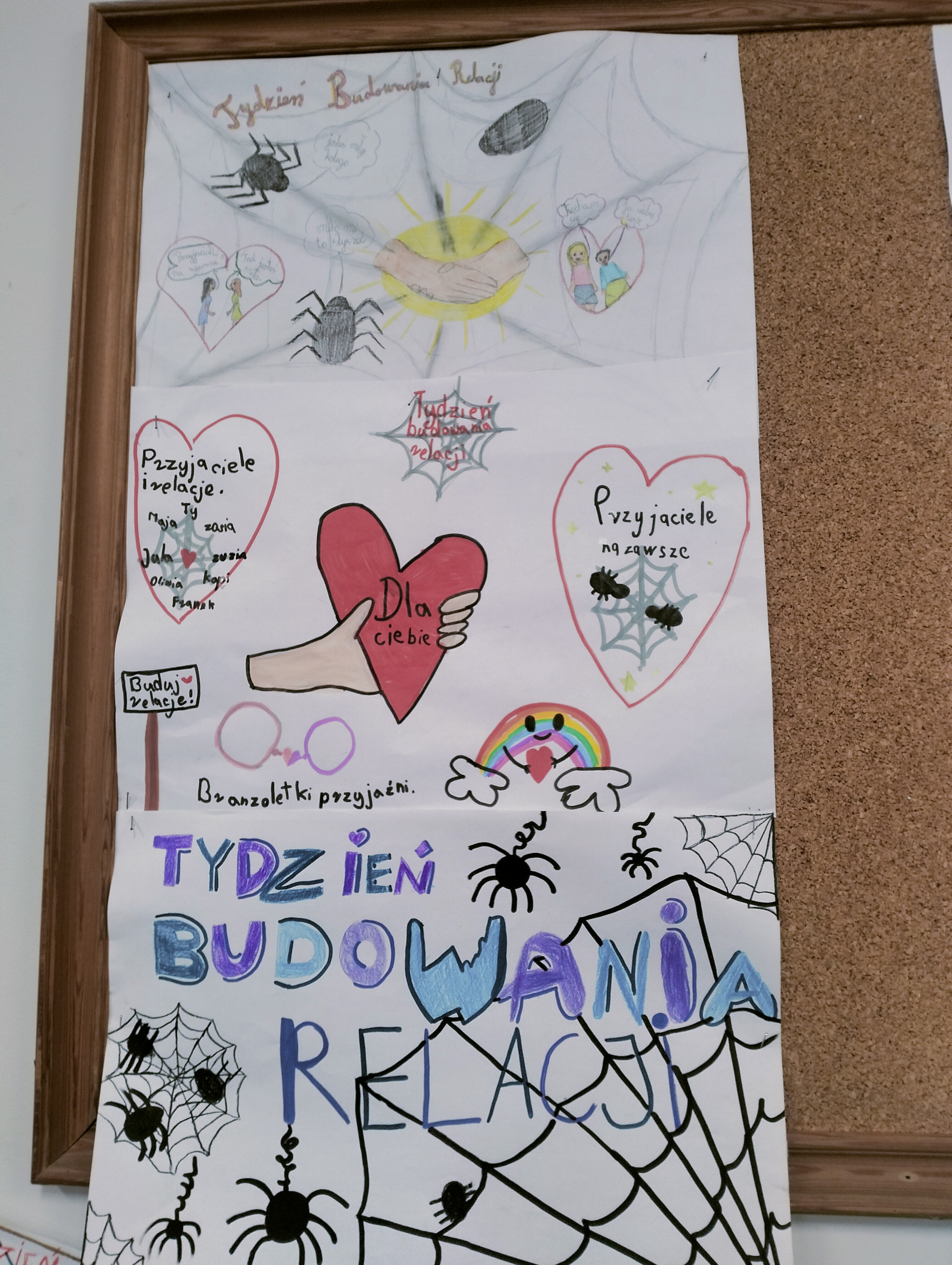W ramach Tygodnia Budowania Relacji i Tygodnia o Przeciwdziałaniu Przemocy Rówieśniczej (29.09.2025 r. - 03.10.2025 r.) w świetlicy szkolnej odbyły się zajęcia poświęcone temu ważnemu tematowi. Dzieci wzięły udział w pogadance o tym, jak rozpoznawać i reagować na przemoc oraz jak budować relacje oparte na szacunku i empatii. Uczniowie wykonali również prace plastyczne, które następnie przekazywali swoim kolegom i koleżankom, dzieląc się przesłaniem życzliwości i wsparcia.