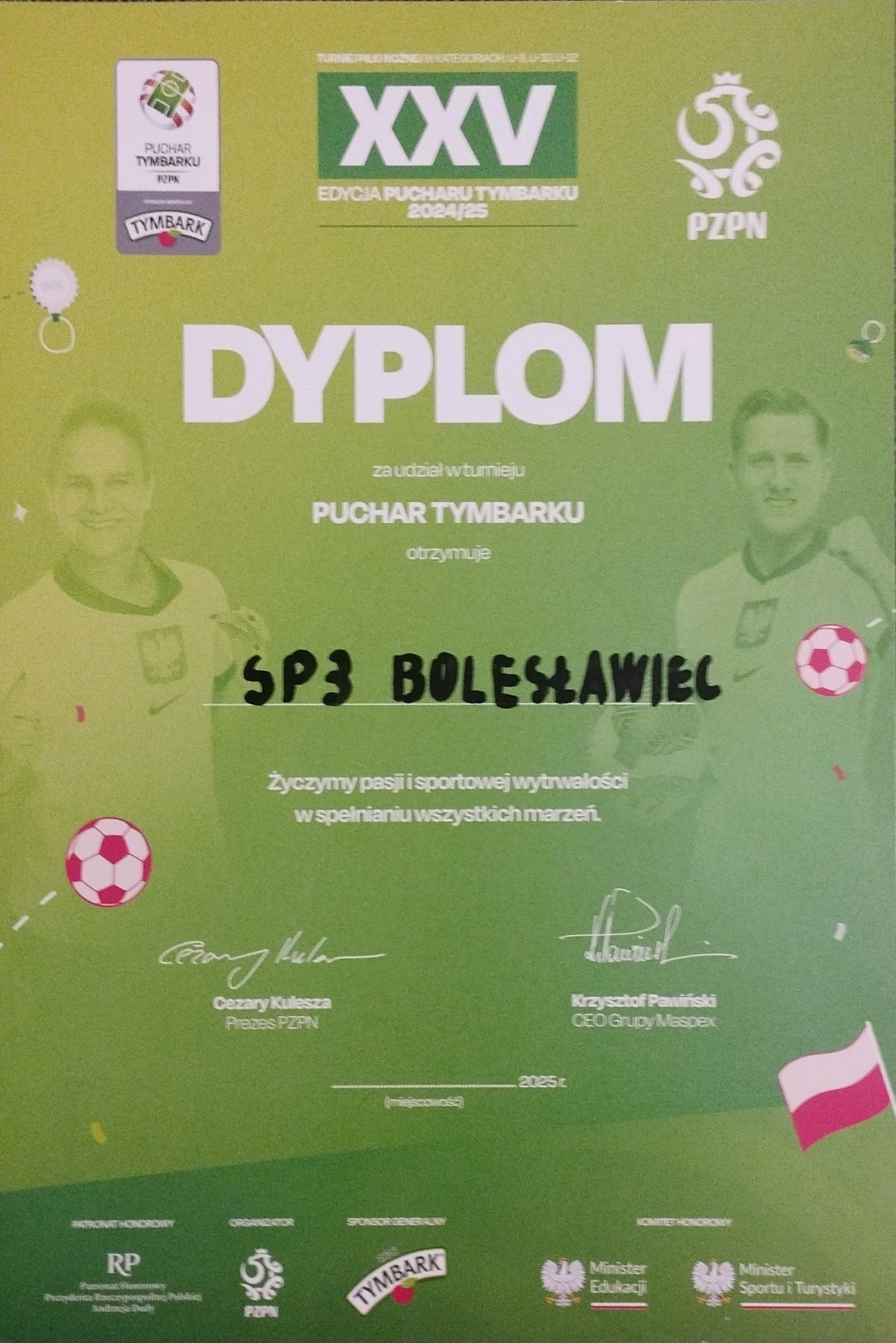 Dnia 10 kwietnia 2025 r. nasza szkoła brała udział w powiatowej rundzie XXV edycji turnieju o Puchar Tymbarku - rozgrywanej na boisku Ośrodka Wodno-Sportowego przy ul. Spacerowej w Bolesławcu. Uczniowie kl. IV-V: JAKUB NIKODEM, SZYMON OSIP, WOJCIECH KOMARNICKI, TYMOTEUSZ SZAJA, FILIP GUZOWSKI, TYMOTEUSZ ŻOŁĄDEK, FILIP KACZYŃSKI, WILLIAM SCHWEIZER, MARCEL KACZMARSKI rywalizowali w kategorii U-12 z uczniami szkół powiatu bolesławieckiego: SP nr 1 i SP nr 5 w Bolesławcu, SP w Kruszynie, SP w Warcie Bolesławieckiej oraz SP w Tomaszowie Bolesławieckim.