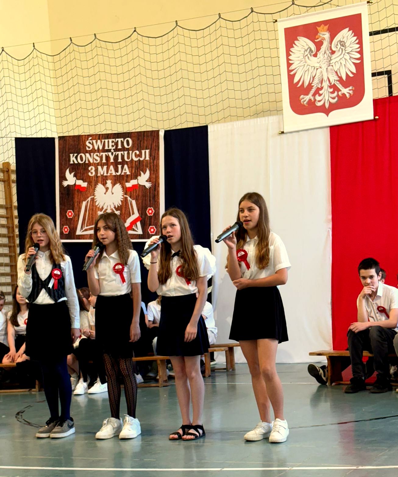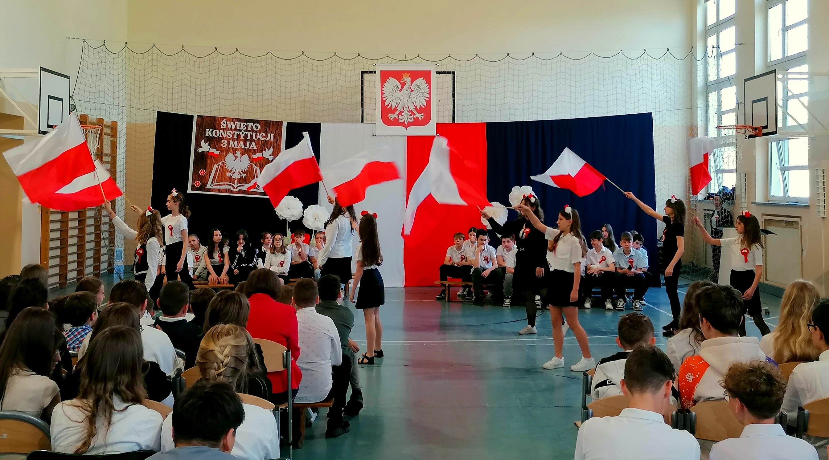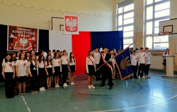 Apel rozpoczęto wprowadzeniem pocztu sztandarowego i odśpiewaniem czterech zwrotek hymnu państwowego. W czasie uroczystości uczniowie przybliżyli historię tego święta, jego znaczenie dla Polski oraz atmosferę tamtych czasów. To była piękna lekcja historii, która pokazała społeczności szkolnej okoliczności ustanowienia konstytucji w 1791 roku. Uczniowie dowiedzieli się o najważniejszych prawach zawartych w tym istotnym dokumencie oraz o jego wpływie na pozycję naszego kraju w Europie. Podkreślono, że Konstytucja Trzeciego Maja była pierwszą w Europie, a drugą na świecie ustawą zasadniczą regulującą organizację władz państwowych oraz prawa i obowiązki obywateli. Nie zabrakło także odświętnych strojów, akcentów muzycznych, wokalnych i tanecznych oraz wyeksponowania symboli narodowych. Uroczystość ta uzmysłowiła wszystkim, jak ważną rolę i znaczenie mają słowa: wolność, naród i ojczyzna.