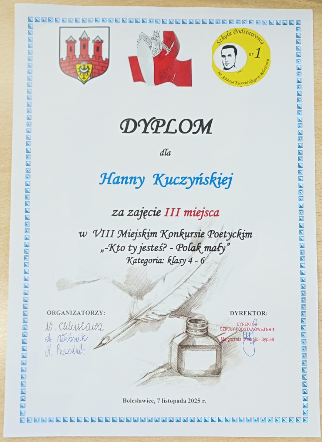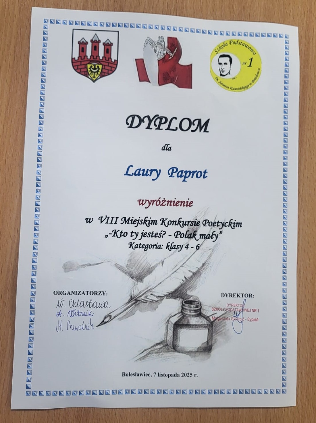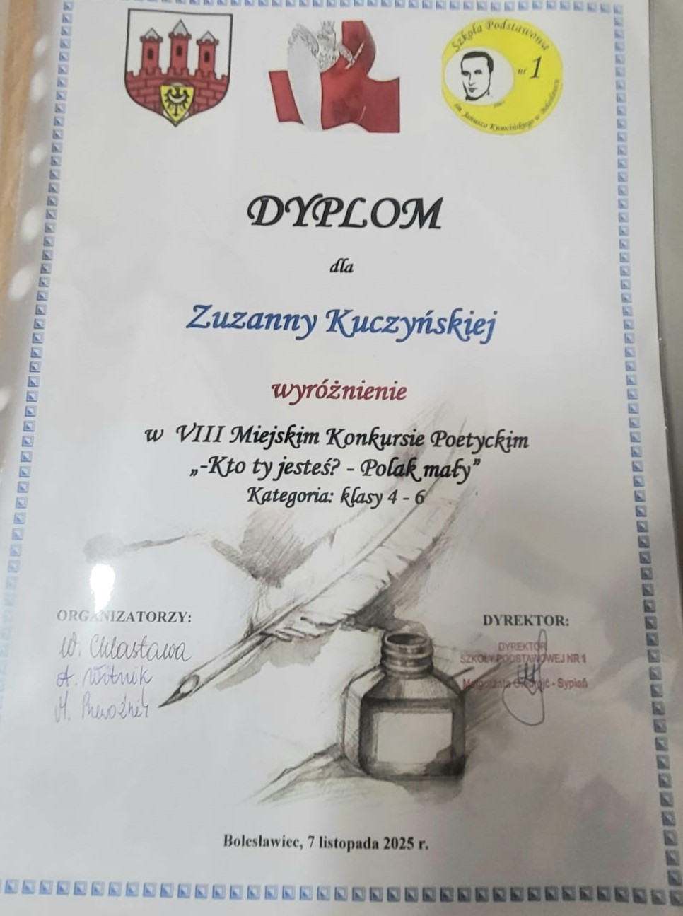 Dnia 7 listopada 2025 r. rozstrzygnięty został VIII Miejski Konkurs Poetycki „Kto ty jesteś? – Polak Mały”. Z radością informujemy, że z naszej szkoły aż 5 uczennic zdobyło w nim laury: