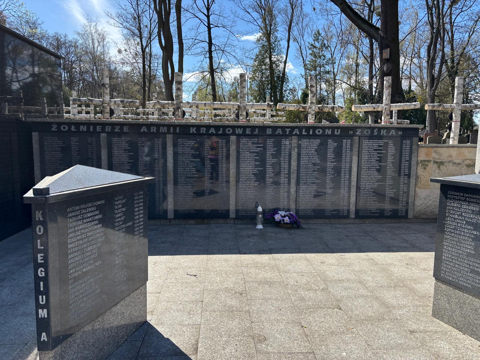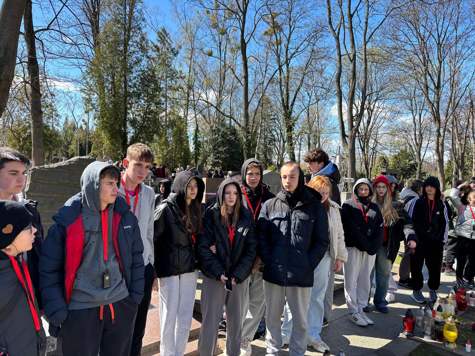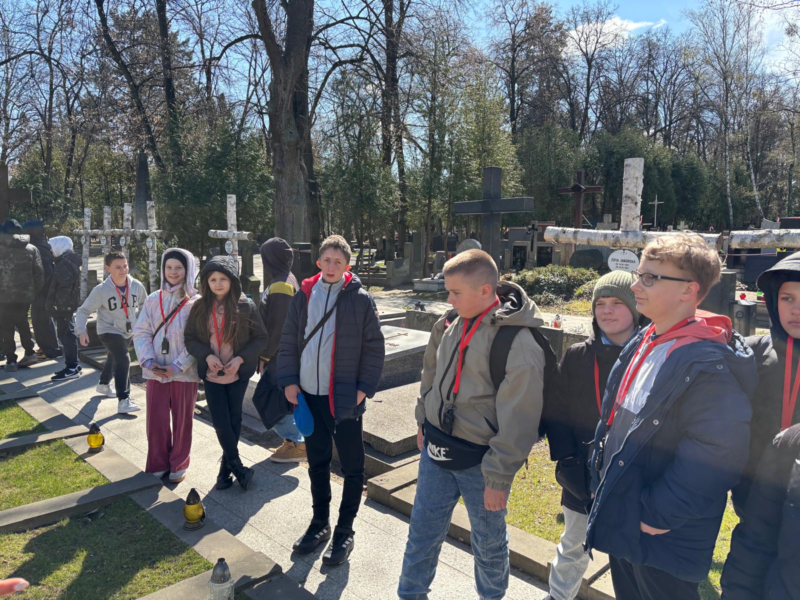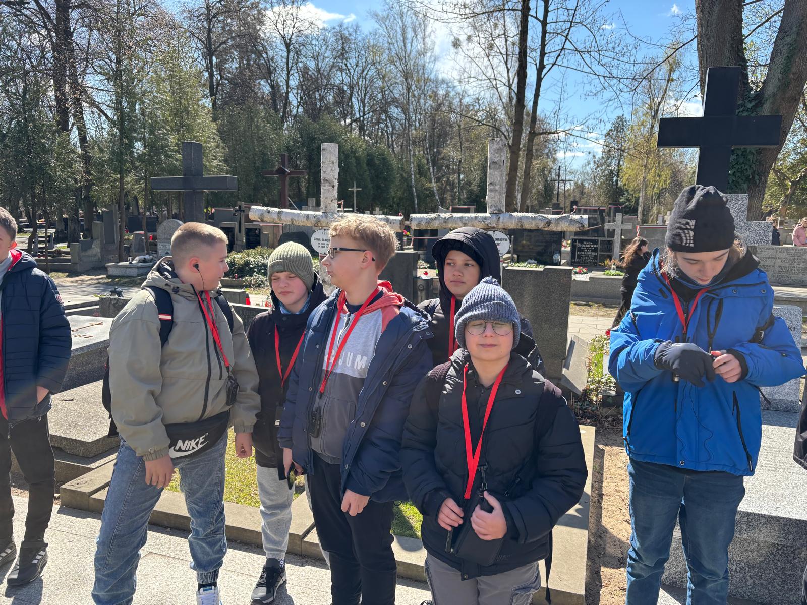 Pierwszym elementem naszej wycieczki były odwiedziny Cmentarza Wojskowego na Powązkach. Miejsce to zrobiło na nas duże wrażenie, gdyż spoczywają na nim żołnierze wszystkich powstań i wojen od połowy XIX wieku, a także działacze społeczni oraz osoby znane ze świata sztuki i polityki. Ich mogiły znajdują się w Alejach Zasłużonych. Uwagę uczniów przykuła kwatera przypisana poległym z Harcerskiego Batalionu Armii Krajowej „Zośka”. W sumie 174 groby młodych ludzi, którzy zginęli w czasie II wojny światowej. Ich cechą charakterystyczną są białe, brzozowe krzyże - umocowane na każdej mogile.