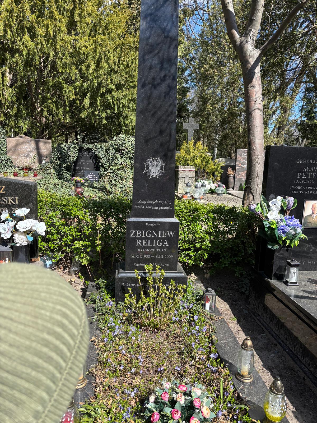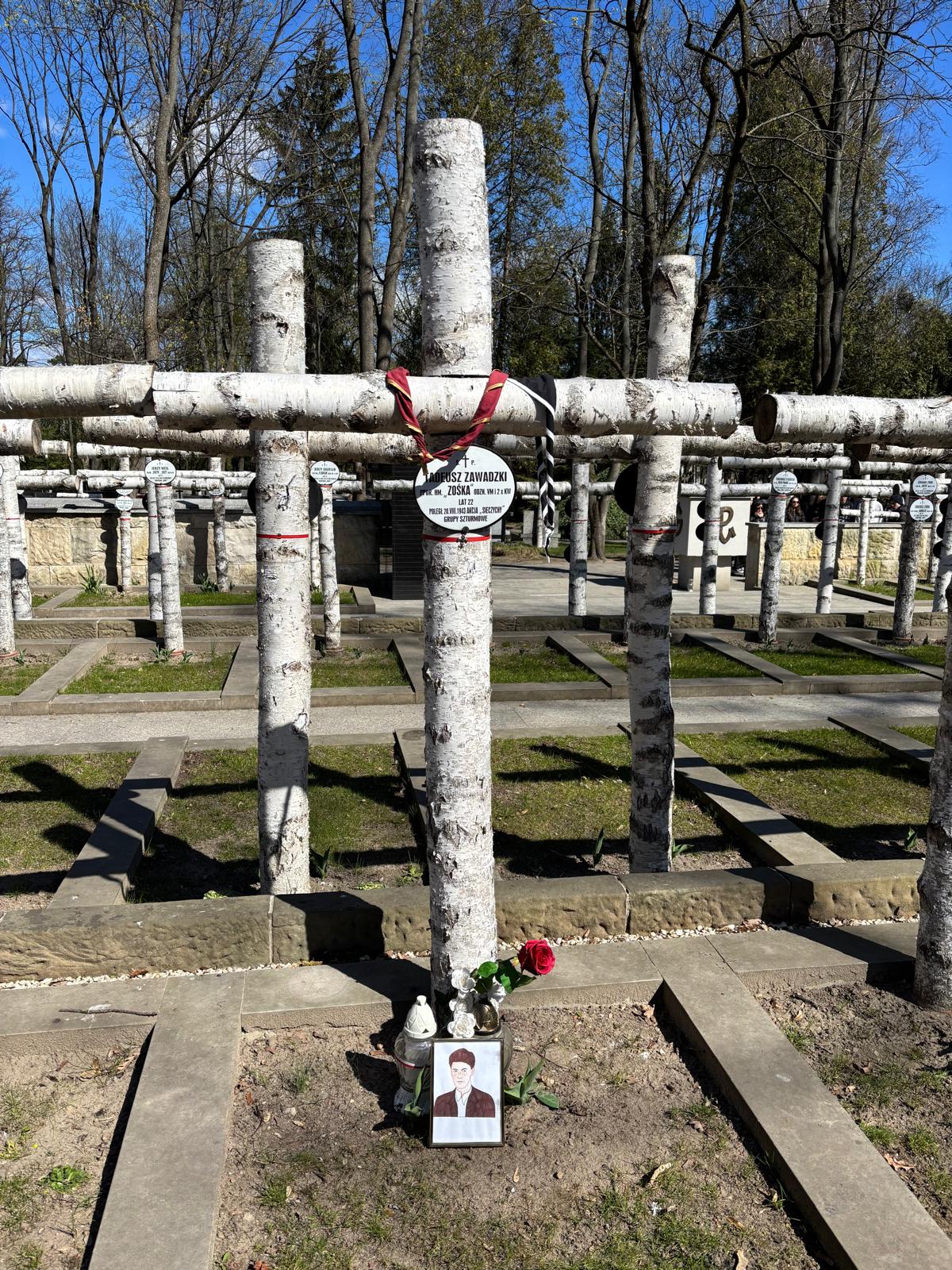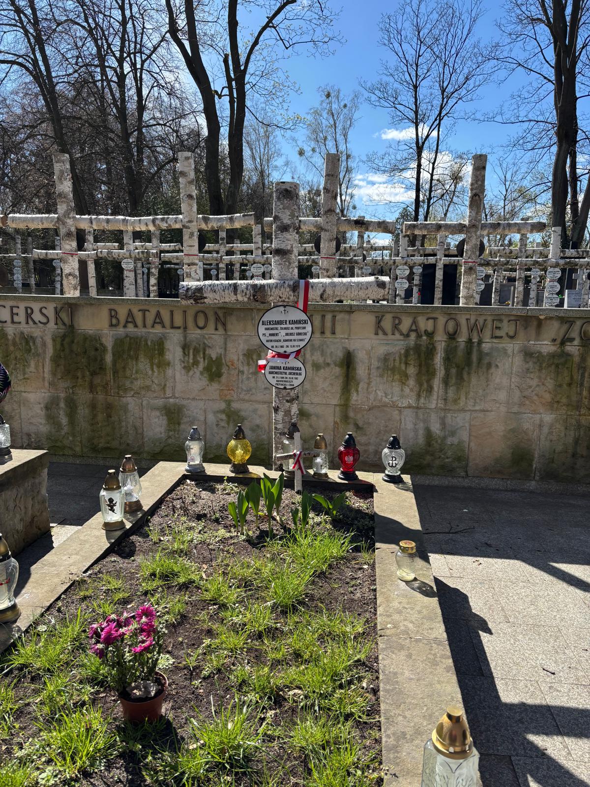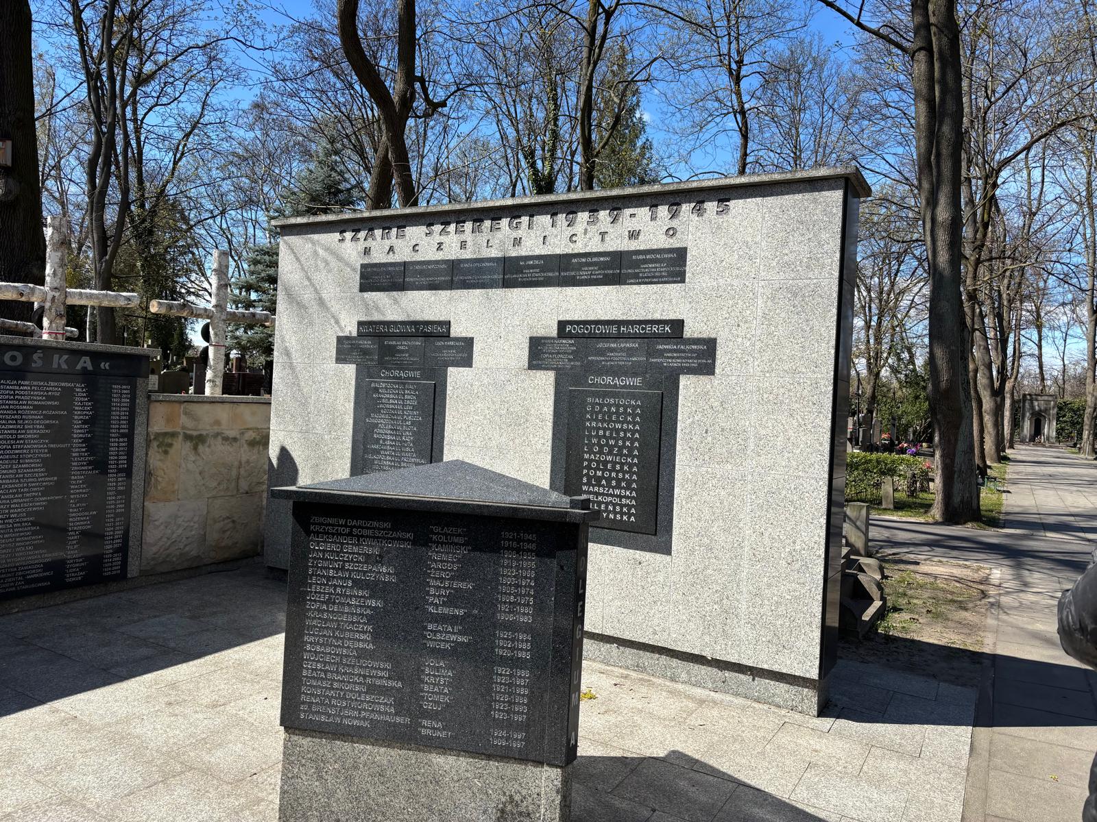 Pierwszym elementem naszej wycieczki były odwiedziny Cmentarza Wojskowego na Powązkach. Miejsce to zrobiło na nas duże wrażenie, gdyż spoczywają na nim żołnierze wszystkich powstań i wojen od połowy XIX wieku, a także działacze społeczni oraz osoby znane ze świata sztuki i polityki. Ich mogiły znajdują się w Alejach Zasłużonych. Uwagę uczniów przykuła kwatera przypisana poległym z Harcerskiego Batalionu Armii Krajowej „Zośka”. W sumie 174 groby młodych ludzi, którzy zginęli w czasie II wojny światowej. Ich cechą charakterystyczną są białe, brzozowe krzyże - umocowane na każdej mogile.