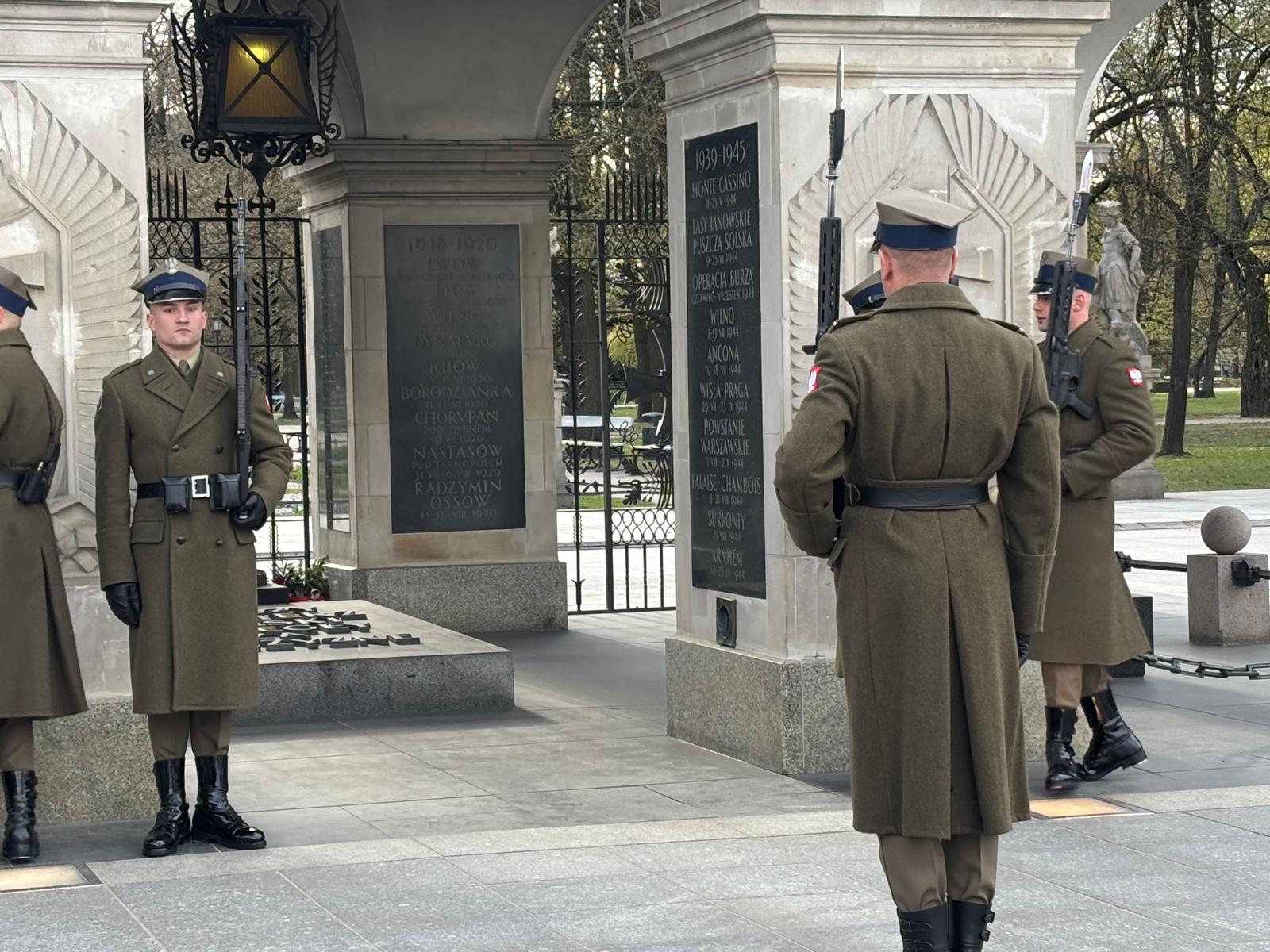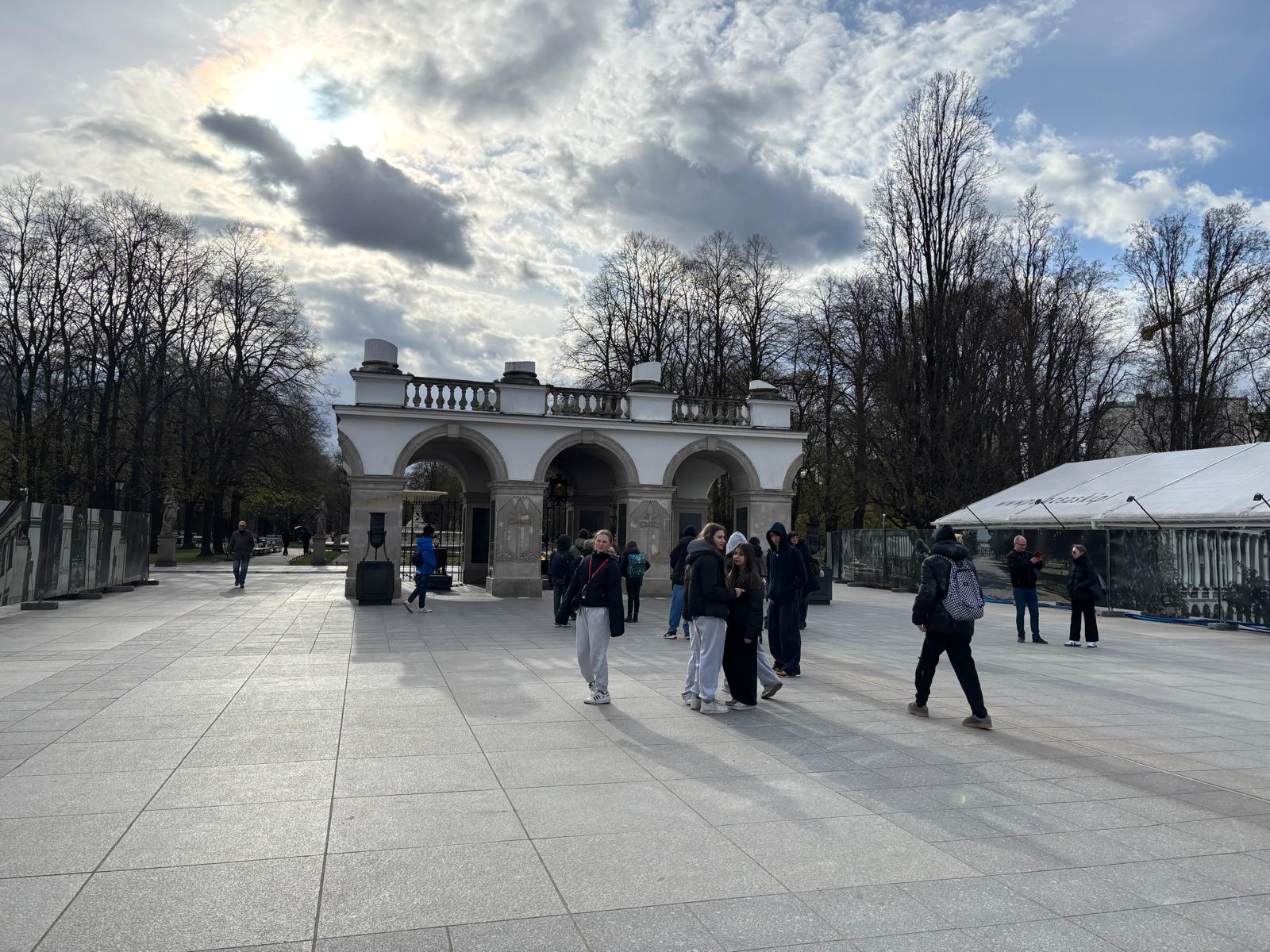 Kolejnym punktem, który odwiedziliśmy, były Łazienki Królewskie - letnia Rezydencja króla Stanisława Augusta Poniatowskiego. Barokowy obiekt wraz z przyległym do niego parkiem powstał w XVIII wieku. Spacerując alejkami podziwialiśmy wiele wolnostojących rzeźb, a także amfiteatr oraz niesamowity Pałac na Wyspie. Odwiedziliśmy również Pomnik Fryderyka Chopina, który znajduje się w parku nieopodal urokliwej fontanny. To właśnie tam odbywają się letnie koncerty Plenerowe. Następnie, spacerując Krakowskim Przedmieściem, mogliśmy zobaczyć Pałac Prezydencki, który od 1994 roku jest oficjalną siedzibą Prezydenta Rzeczypospolitej Polskiej, a także podziwiać znajdujący się tam pomnik księcia Józefa Poniatowskiego. W dalszej części wycieczki odbyliśmy spacer wzdłuż murów obronnych Starego Miasta, aby dotrzeć do Pomnika Małego Powstańca - znajdującego się przy ulicy Podwale. Pomnik ten upamiętnia najmłodszych uczestników Powstania Warszawkiego, a nam uświadamia, jak młode osoby walczyły w obronie naszej stolicy. Następnie udaliśmy się do Grobu Nieznanego Żołnierza, będącego pamiątką i hołdem żołnierzom poległym w czasie I wojny światowej we Francji. Z zainteresowaniem podglądaliśmy żołnierzy z Batalionu Reprezentacyjnego Wojska Polskiego, pełniących w tym czasie honorową wartę przed Grobem.