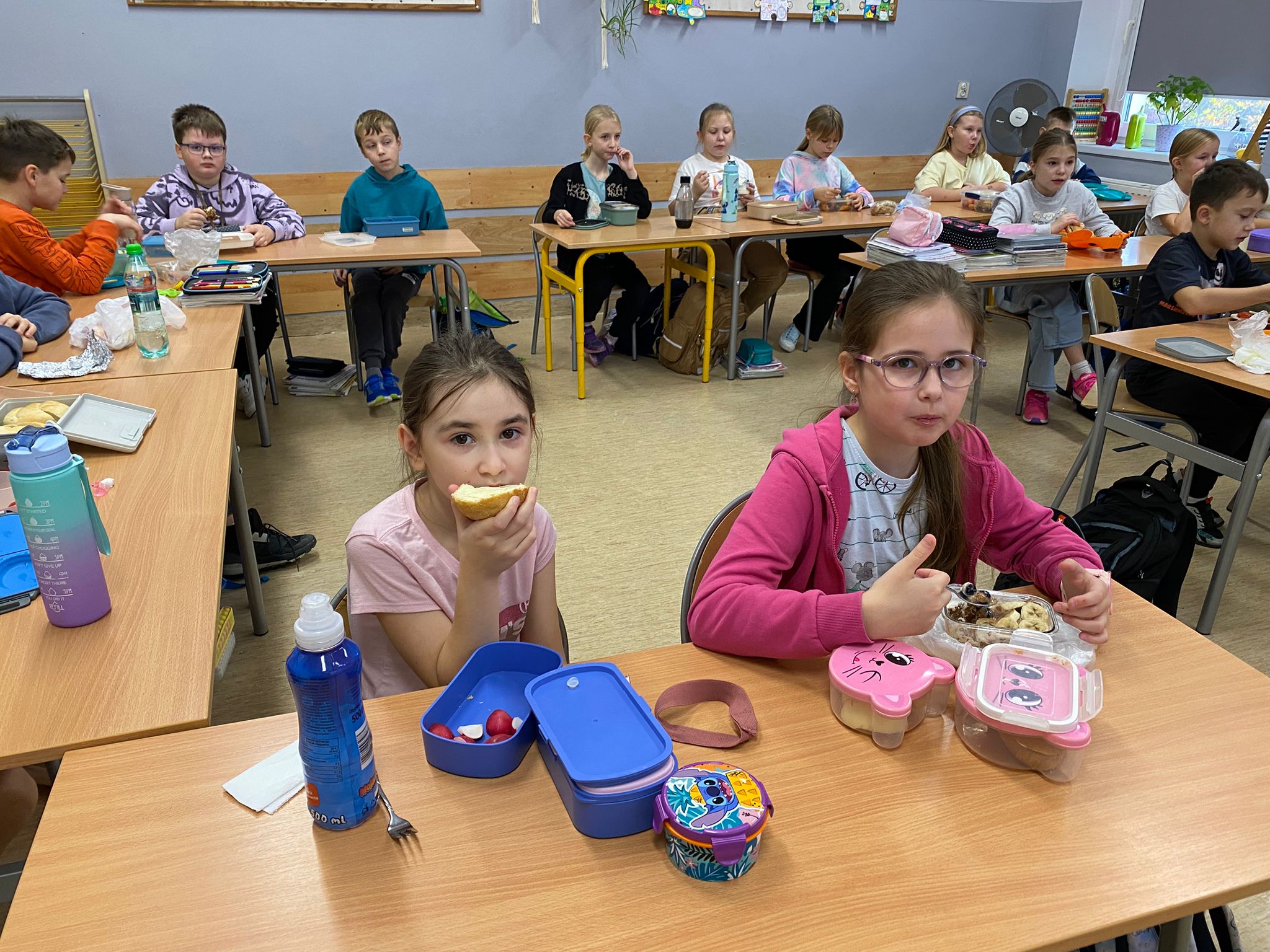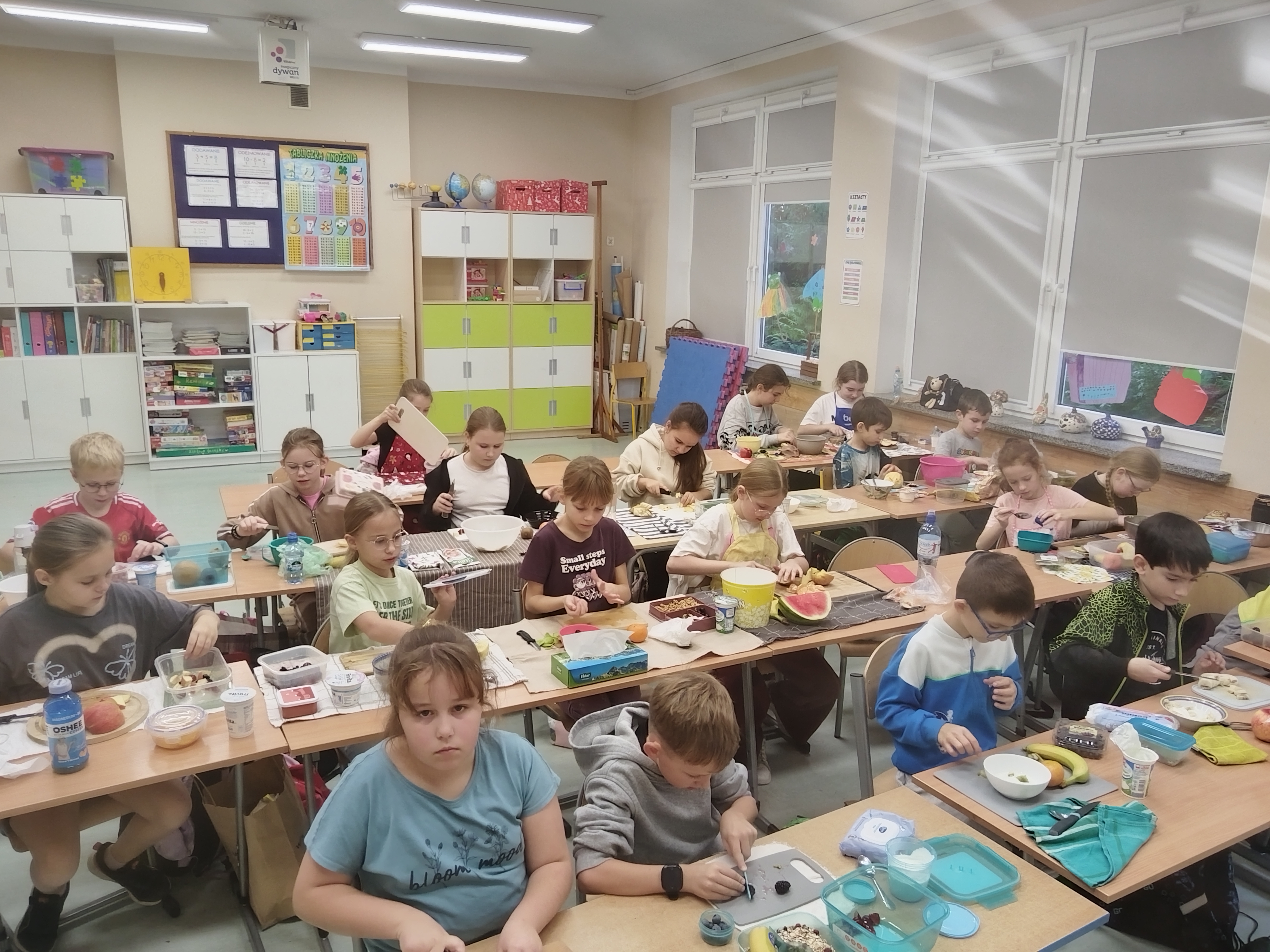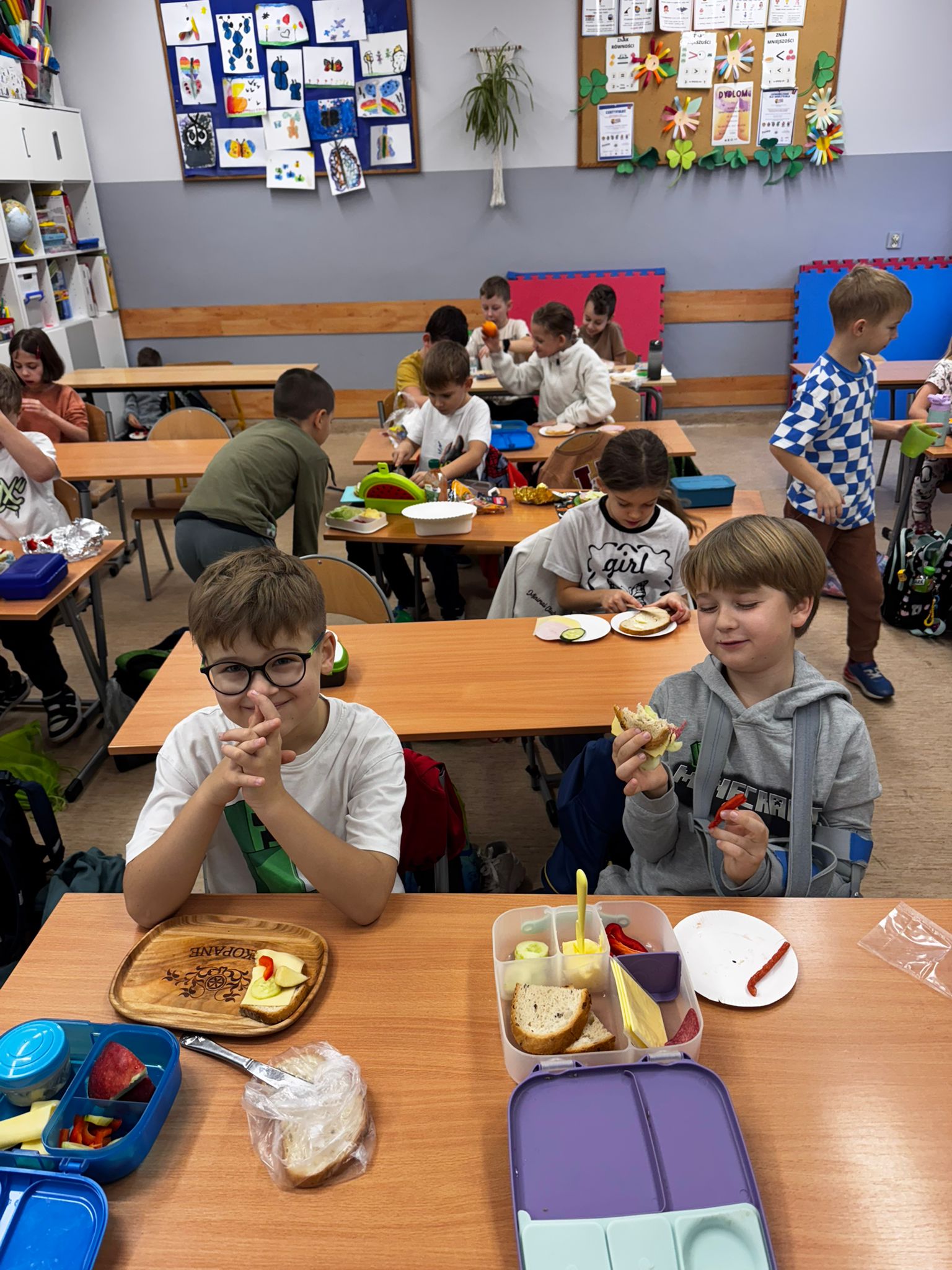 Śniadanie to najważniejszy posiłek w ciągu dnia. Dzięki niemu dzieci mają energię do nauki, lepiej koncentrują się podczas lekcji i mają siłę do zabawy. Zdrowe śniadanie to dobry początek dnia. Dlatego też, podobnie jak w ubiegłym roku, w dniu 14 listopada 2025 r. uczniowie klas 2a, 3a i 3b przygotowywali zdrowe posiłki. Do wykonania własnego musli dzieci wykorzystywały jogurty naturalne, banany, borówki, kiwi, mandarynki i mango. Natomiast do kolorowych kanapek - sery i warzywa.