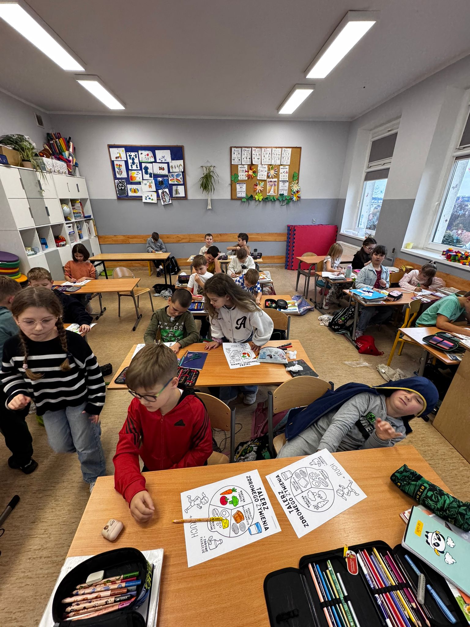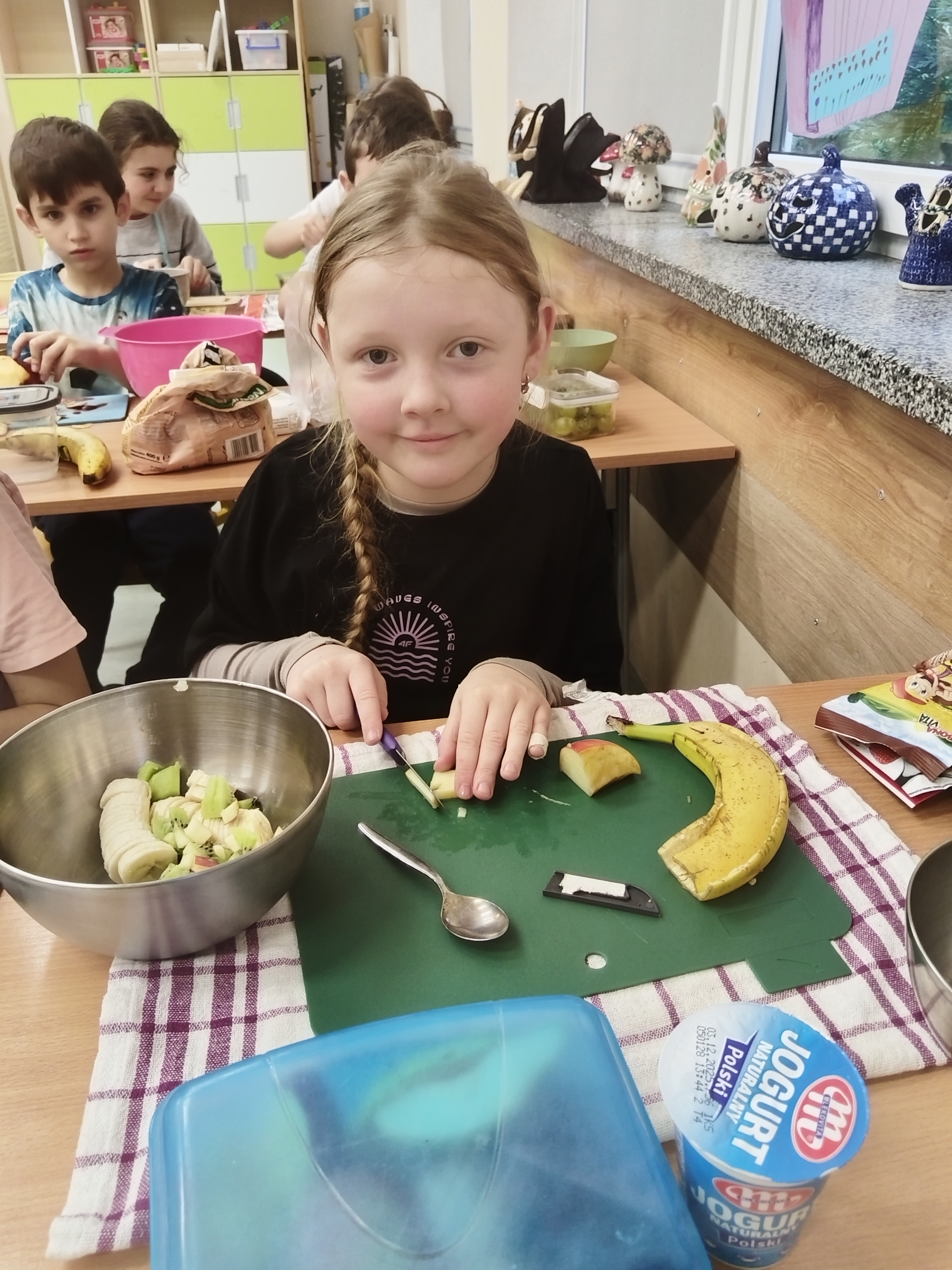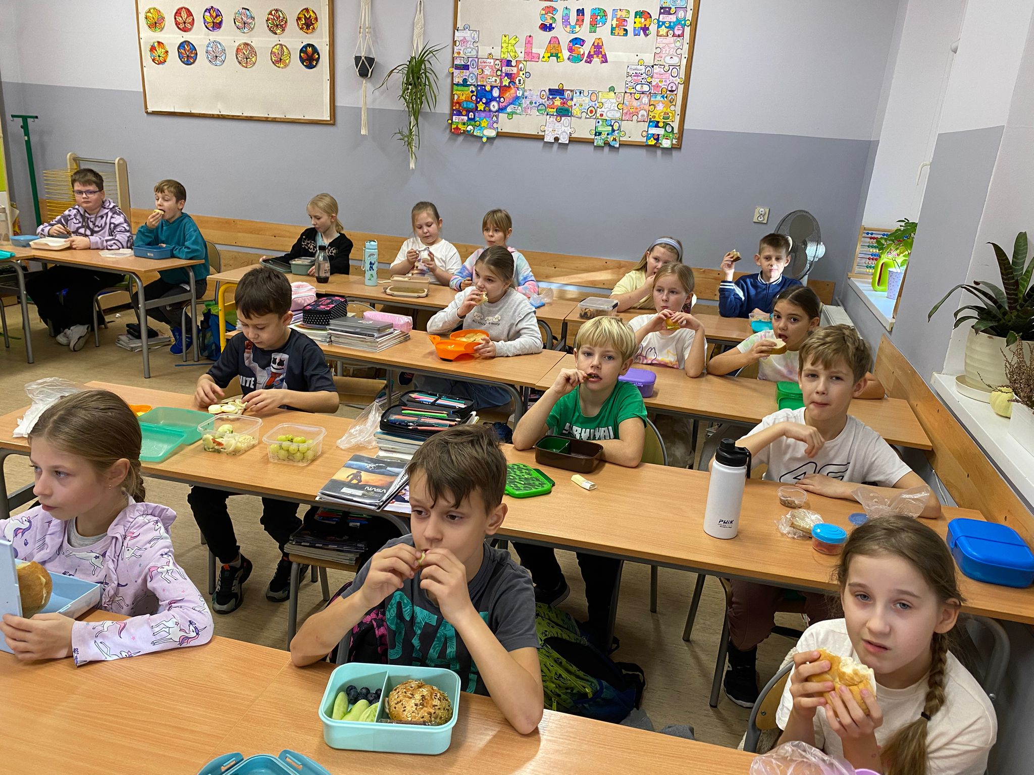 Śniadanie to najważniejszy posiłek w ciągu dnia. Dzięki niemu dzieci mają energię do nauki, lepiej koncentrują się podczas lekcji i mają siłę do zabawy. Zdrowe śniadanie to dobry początek dnia. Dlatego też, podobnie jak w ubiegłym roku, w dniu 14 listopada 2025 r. uczniowie klas 2a, 3a i 3b przygotowywali zdrowe posiłki. Do wykonania własnego musli dzieci wykorzystywały jogurty naturalne, banany, borówki, kiwi, mandarynki i mango. Natomiast do kolorowych kanapek - sery i warzywa.