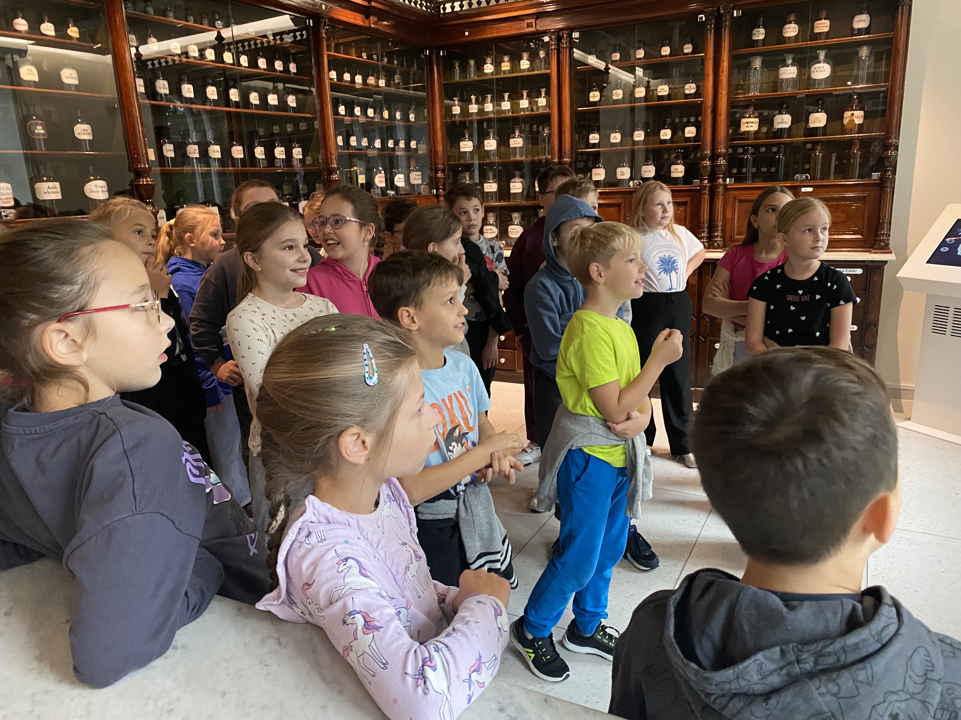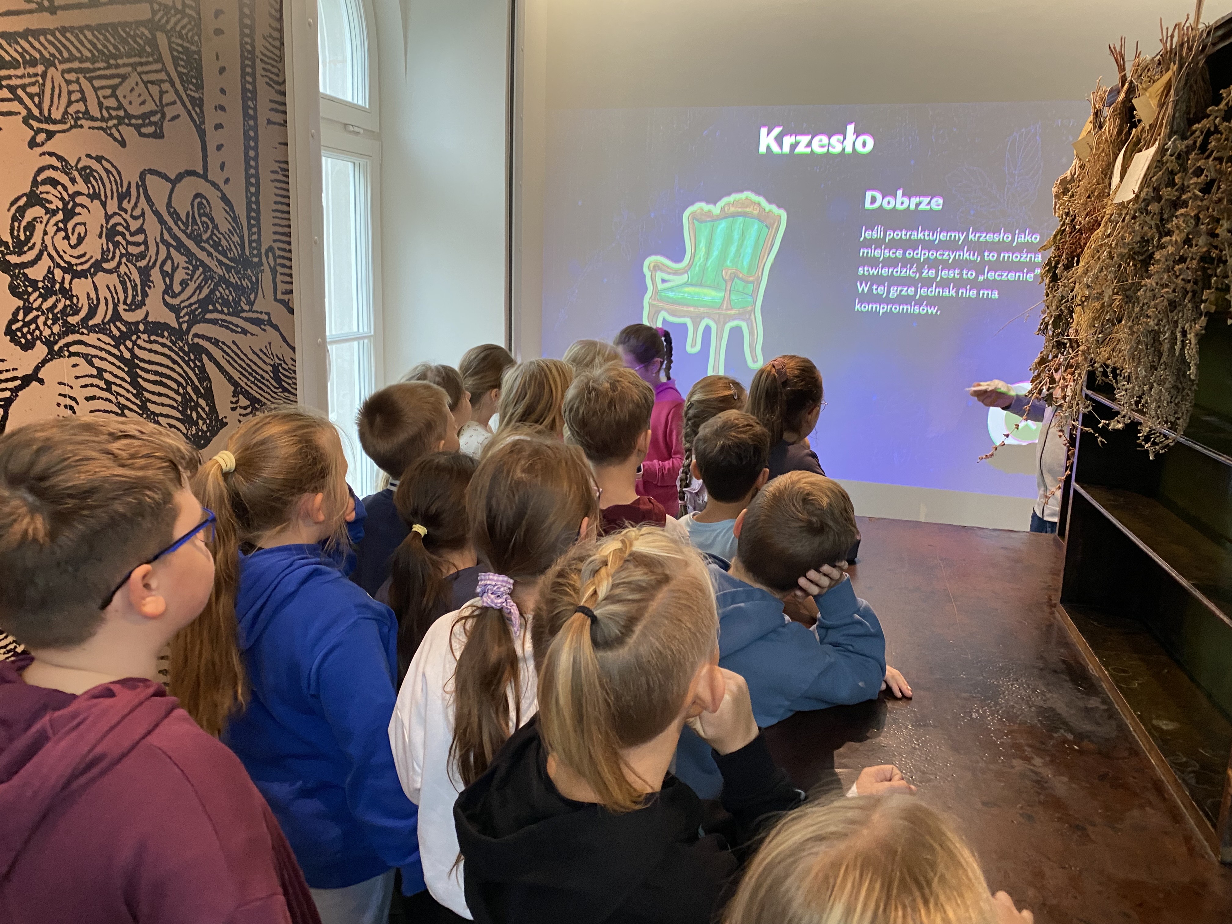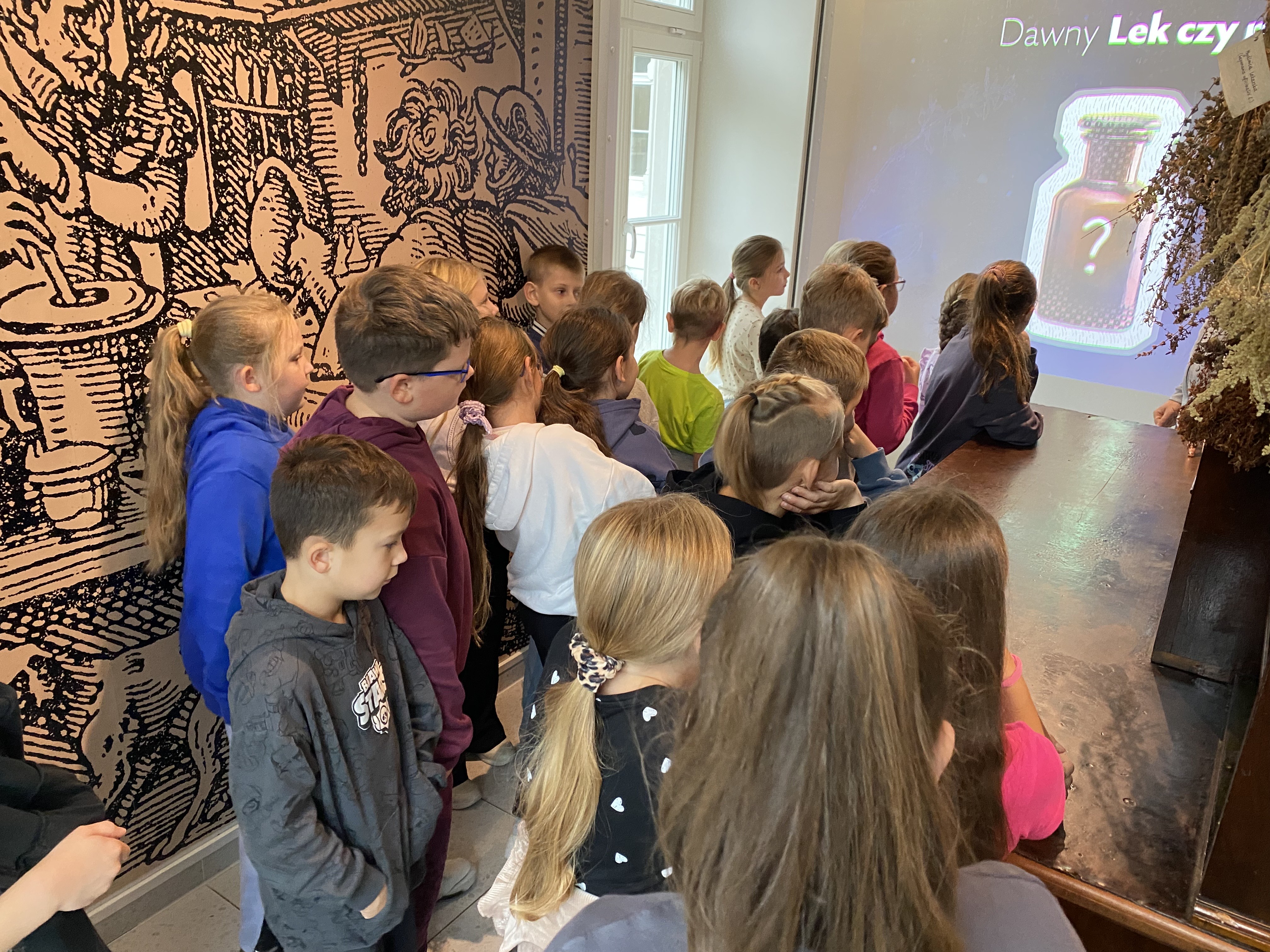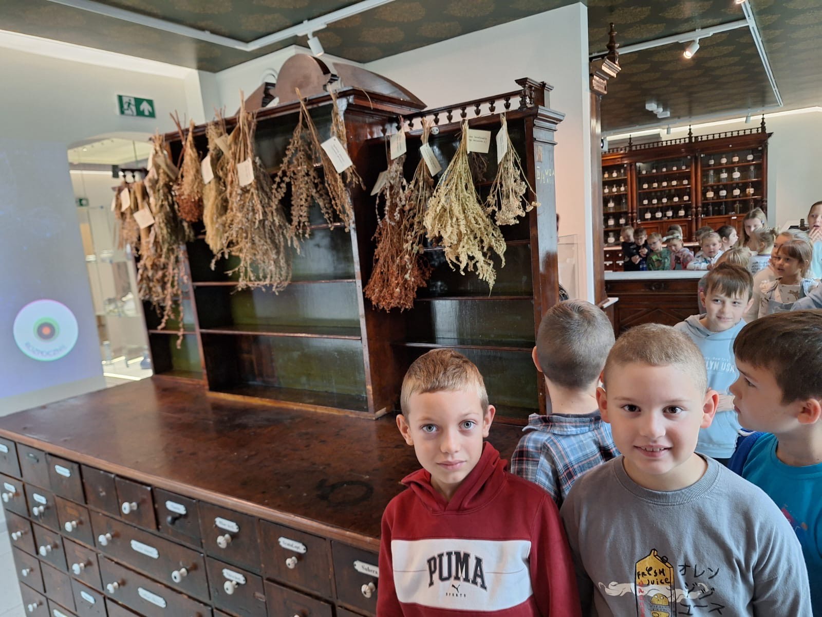 W dniu 8 października 2025 r. uczniowie kl. 2b i 3b wybrali się na wyjątkową wyprawę do świata ziół i dawnych receptur. Podczas warsztatów zielarskich dzieci miały okazję przenieść się w czasie i odkryć tajniki naturalnego leczenia sprzed lat. Wnętrze starej apteki od razu zachwyciło uczestników - drewniane regały, szklane fiolki i zapach suszonych ziół stworzyły niesamowitą atmosferę. Pod czujnym okiem prowadzącego uczniowie poznali właściwości popularnych roślin leczniczych, takich jak: rumianek, mięta, nagietek czy lawenda. Nie zabrakło również części praktycznej - każdy uczestnik mógł własnoręcznie przygotować ziołowe woreczki zapachowe. Dzieci z zaangażowaniem mieszały i pakowały swoje zielarskie wyroby, ucząc się jednocześnie, jak dawniej dbano o zdrowie bez pomocy nowoczesnych leków.